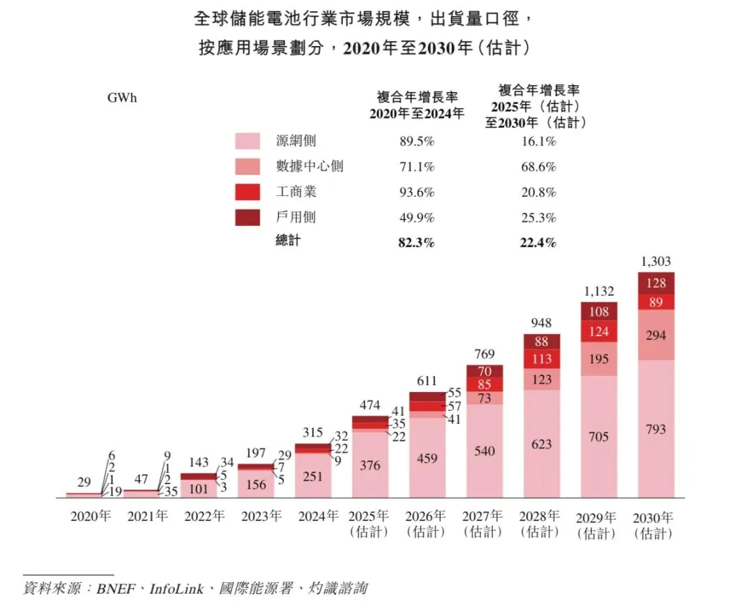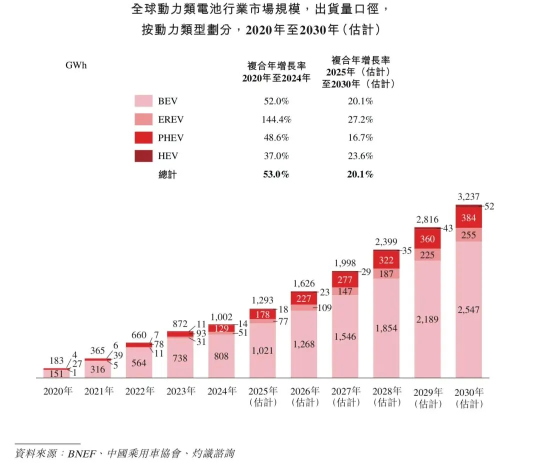 全球动力类电池出货量从2020年的183 GWh增长至2024年的1,002 GWh,复合年增长率为53.0%,并预计从2025年的1,293 GWh进一步提升至2030年的3,237 GWh,复合年增长率为20.1%。