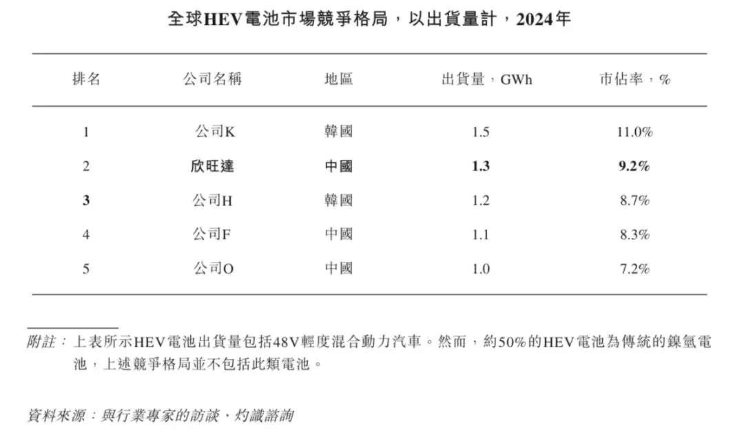 于HEV电池领域,按2024年出货量计,欣旺达是全球第二大厂商,也是最大的中国厂商。