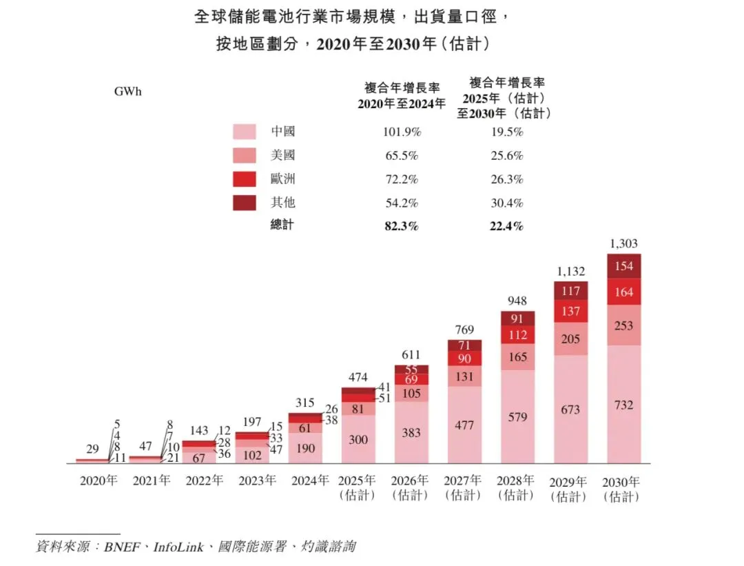 中国是全球最大的储能电池市场,依托于风能和太阳能资源大规模开发,以及「新能源+储能」政策强力推动,2024年,中国储能电池出货量为190 GWh,占全球市场的比例为60.3%,预计于2030年将进一步增长至732 GWh,2025年至2030年的复合年增长率为19.5%。