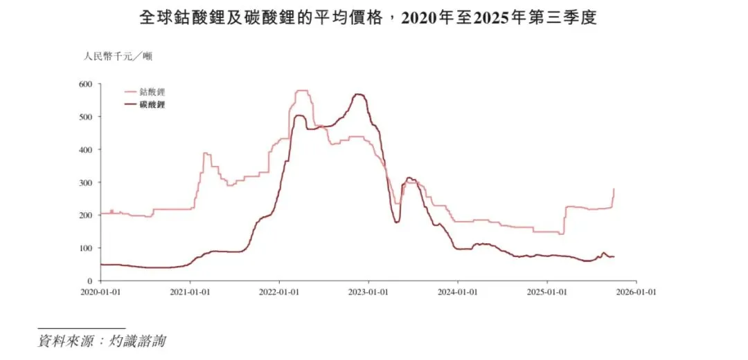 根据灼识咨询的资料,钴酸锂的行业平均价格从2021年上半年的约人民币310千元╱吨增长至2022年上半年的约人民币510千元╱吨,随后钴酸锂价格逐渐回落,并于2025年上半年降低至人民币190千元╱吨,随后于2025年第三季度恢复至约人民币250千元╱吨。碳酸锂的平均价格由2020年下半年的约人民币40千元╱吨增长至2021年下半年的约人民币160千元╱吨,并进一步增长至2022年下半年的约人民币520千元╱吨,之后碳酸锂价格逐渐走低至2025年第三季度的约人民币70千元╱吨。