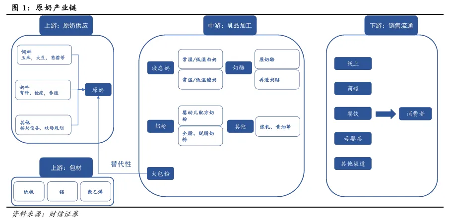 乳制品行业分为三个核心环节:上游奶牛养殖、中游乳制品加工以及下游产品分销。上游,奶牛养殖环节通过饲养奶牛来采集并销售生鲜奶(即未经加工处理的原奶)以及大包奶粉(生鲜奶经消毒、脱水、干燥处理后制成的乳粉)。中游乳制品加工环节涉及采购生鲜奶或大包奶粉,并将其加工成液态奶、奶粉、奶酪等多种乳制品。下游产品分销环节则通过区域经销商、大型超市、电商平台等多渠道分销网络将产品销售给终端消费者。