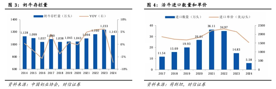 2024年以来,我国奶牛存栏持续下降。据中国奶业协会数据,2024年,我国奶牛存栏量为1143万头,同比下滑7.29%。2014-2024年十年间我国奶牛存栏量的年复合增速约为0.13%。可以发现,奶牛产能的增长显著慢于牛奶产量的增长,侧面印证行业技术进步带来的养殖效率提升。国内奶牛优质产能的建设离不开进口种牛。2021-2022年是我国活牛进口高峰期,分别进口活牛36万头和35万头,这也是我国牧业集团集中新建、扩建牧场的两年。随着奶源过剩问题凸显,需求端疲软带来的生鲜乳价格持续下降,行业开启了2024年以来的奶牛产能去化进程。2025年,我国奶牛存栏持续下降。根据农业农村部畜牧兽医局监测数据显示,2025年初我国奶牛存栏615.9万头,到9月份下降至596万头,比年初下降3.2%,成母牛存栏从315.3万头减少至312.7万头。我国原奶持续过剩,2025年4季度奶牛存栏保持下降趋势,年底预计总存栏减少到590万头,继续减少5-6万头,成母牛预计达到310万头,继续减少2-3万头。