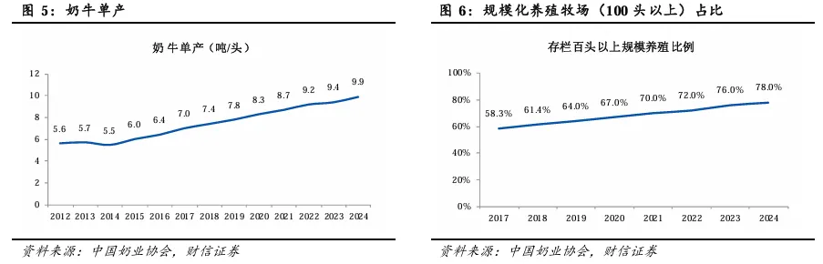 过去十年,我国奶牛养殖行业高质量发展,奶牛存栏量稳步提升,生产效率显著提升,具体体现在奶牛的规模化养殖比例和奶牛的单产均有显著提升,共同作用之下,我国牛奶产量稳步提升。我们认为我国牛奶产量主要影响因素为:1)泌乳牛数量;2)奶牛单产水平。