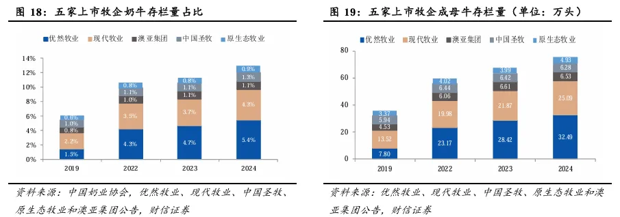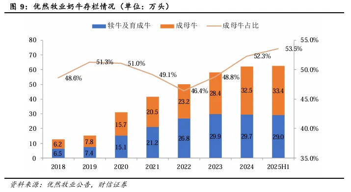 以行业龙头优然牧业为例,公司成母牛和后备牛(犊牛+育成牛)基本围绕50:50的比例波动。2023年以来,公司产能扩张的脚步放缓,奶牛存栏量维持稳步增长的水平,且后备牛占比持续下降。