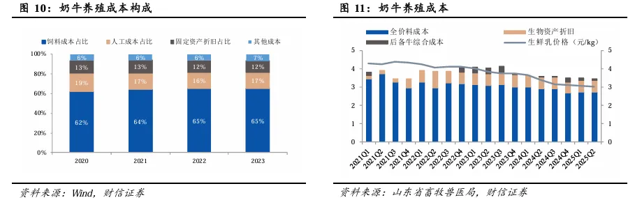 据山东省畜牧兽医局,可将奶牛养殖全成本分为成母牛公斤奶成本加上后备牛综合成本,其中成母牛公斤奶成本由全价料成本和生物资产折旧构成。对比当季的生鲜乳收购价格来看,2023年开始行业基本进入亏损阶段,且2024年以来亏损幅度有逐季扩大趋势。2024Q1-2025Q2各季度公斤奶亏损金额为0.01/0.23/0.38/0.38/0.42/0.41元。