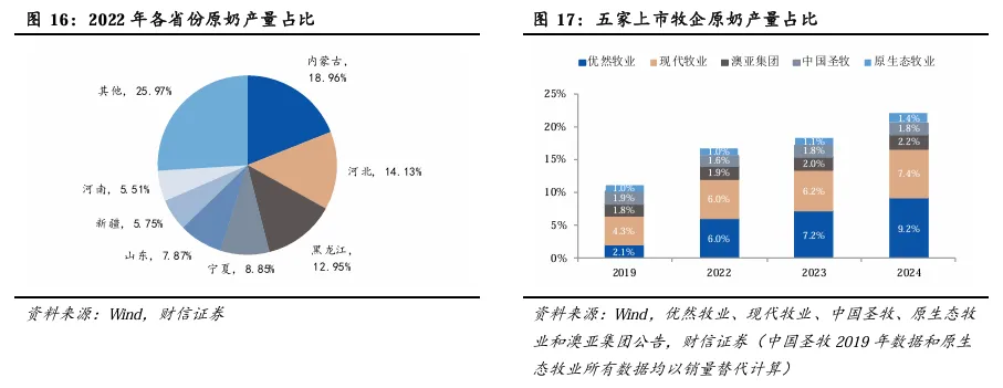 原奶供应市场分散,但集中度在持续提升。受奶牛饲养习性、气候条件以及植被分布等多重因素的综合影响,我国牛奶生产区域主要集中在北方区域。2022年,国内主要原奶产区分别为内蒙古、河北、黑龙江、宁夏、山东、新疆和河南,CR7达74%。因行业特性,奶牛养殖较为分散,尚未孕育出占据市场主导地位的大型企业。2024年,优然牧业、现代牧业、澳亚集团、中国圣牧和原生态牧业的原奶产量分别为375/301/92/74/57万吨,占比分别为9.19%/7.37%/2.25%/1.80%/1.39%,CR5从2019年的11.20%提升至2022年的16.68%,再次提升至2024年的21.99%。