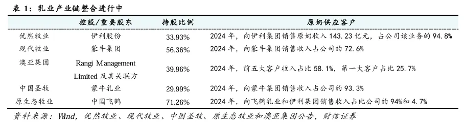 1)乳业产业链整合进行中。国内中游乳制品制造环节的集中度高,为确保原奶供应稳定,控制产品安全和质量,大型乳制品企业向产业链上游发展,与上游产业链的行业参与者进行整合。