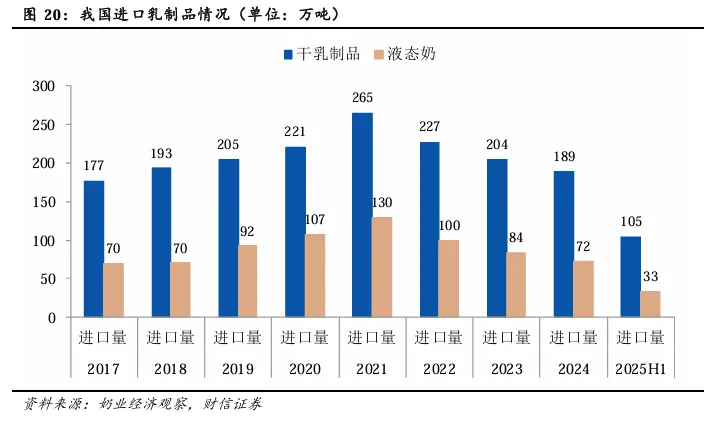 我国有较大规模的进口大包粉市场。2021年,进口大包粉的数量达到峰值约128万吨,而后因国内产能释放和需求的疲软,进口大包粉数量持续减少至2024年约64万吨,直至2025年上半年略有增长,增幅为3.00%。我们将国内牛奶产量和进口大包粉按照8:1的比例还原后视为我国原奶总供给,从而计算出我国原奶供应对进口大包粉的依存度。可以发现,过去依存度在10-20%区间水平。2025年上半年,进口大包粉的依存度为14.47%,较2024年有较明显提升。