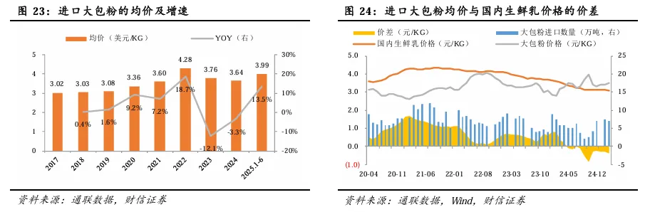 当前进口大包粉价格优势已不再,有望为国内生鲜乳价格筑底反弹提供优质基础。通常,进口大包粉具备一定的价格优势。过去,海关统计的进口大包粉的均价(一般为到岸价,为了对比按照当月平均汇率换算)一直低于国内生鲜乳均价,直至2024年5月份发生变化,进口大包粉价格出现倒挂。具体来看,2022年,进口大包粉的均价达到峰值4.28美元/公斤,随后价格下降,2025年上半年均价为3.99美元/公斤,同比提升13.54%。