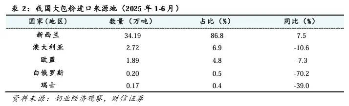 我国大包粉的主要进口国为新西兰。2025年上半年,我国大包粉从新西兰进口34.19万吨,占86.8%,同比增加7.5%;澳大利亚进口2.72万吨,占6.9%,同比减少10.6%;欧盟进口1.89万吨,占4.8%,同比减少7.3%。