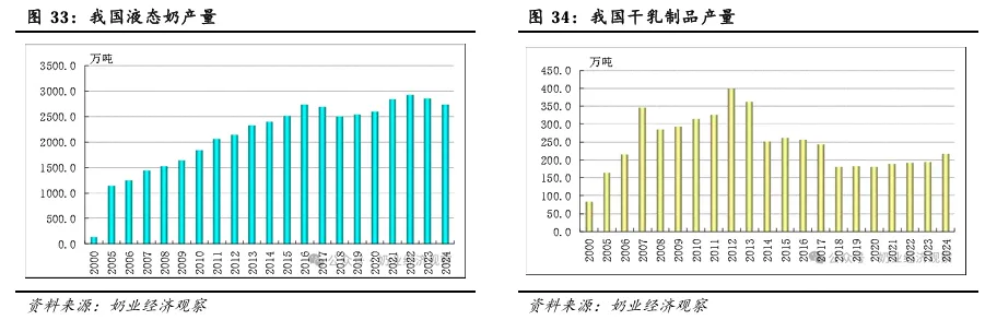 分液态奶和干乳制品来看,液态奶产量在2016年以来基本结束了过去较快的增长,来到2500-3000万吨震荡区间,干乳制品产量则经过调整后开始稳步小幅提升。2024年,液态奶产量为2860万吨,干乳制品产量为225万吨。
