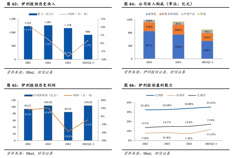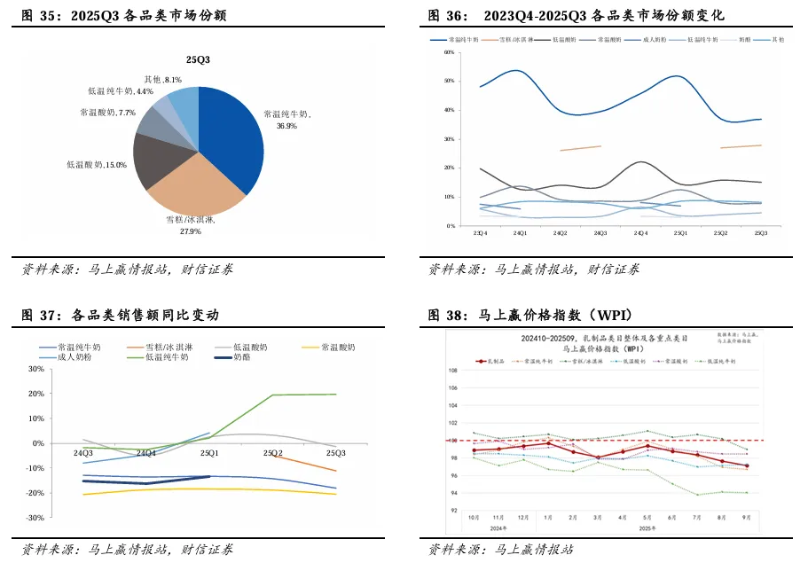 1)从各品类市场份额看,常温纯牛奶占比有所下滑。2025Q3,常温纯牛奶/冰淇淋/低温酸奶/常温酸奶/低温纯牛奶/其他奶制品的份额分别为36.9%/27.9%/15.0%/7.7%/4.4%/8.1%,占比分别同比-2.7/+0.3/+1.7/-0.8/+1.2/+0.4pp。