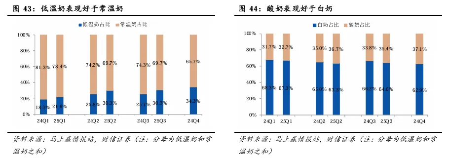 从常温奶和低温奶内部占比来看,低温奶占比提升趋势明显。2025Q1-3,低温奶在液体奶中占比分别提升2.92/4.51/4.68pp。从白奶和酸奶内部占比来看,酸奶占比持续提升。2025Q1-3,酸奶在液体奶中占比分别提升1.02/1.70/1.64pp。