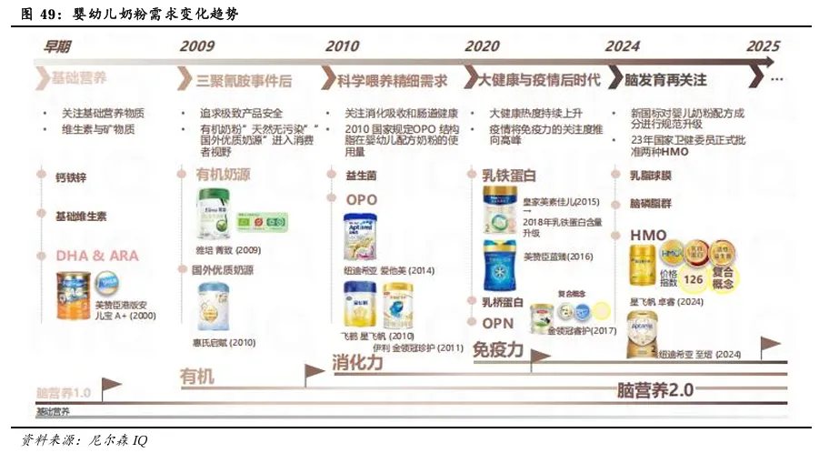 消费者对于婴幼儿产品的偏好受明显的时代驱动,从早期注重基础营养,到讲究科学喂养下的精细需求,再到当前关注脑发育变化。消费者需求提升驱动产品持续创新升级,也推动行业往高端化发展。