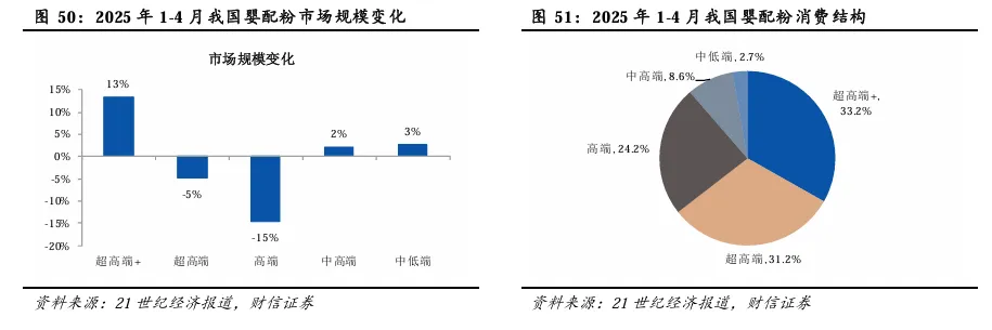 根据尼尔森IQ报告,2024年,婴儿奶粉品类中超高端品类的产品需求从32.8%上升至37%,高端婴儿辅食产品的需求从15.6%上升至19.6%。而2025年1-4月,婴配粉超高端+市场同比增长13.3%,超高端市场同比下滑4.8%,高端市场同比下滑14.6%,中高端同比增长2%,中低端市场同比增长2.7%。从市场占比来看,超高端+市场达到33.2%,超高端市场达到31.2%,高端市场达到24.2%,中高端市场达到8.6%,中低端市场达到2.7%。