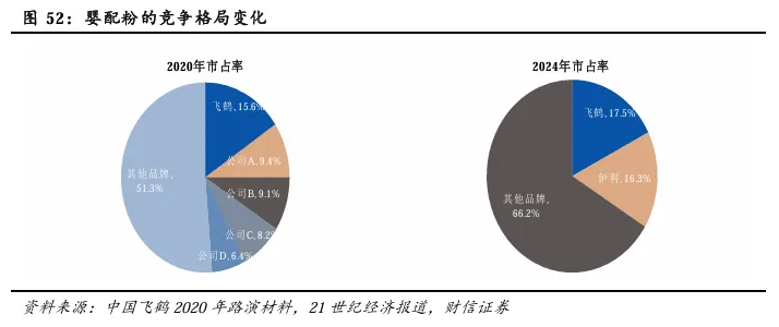 市场竞争格局来看,婴配粉的市场集中度较高,国产品牌的市占率不断提升。2020年,婴配粉行业的CR5约为48.7%,其中,飞鹤的市占率为15.6%。2024年,飞鹤和伊利在国内婴配粉的市场占有率分别为17.5%和16.3%,其中,伊利股份通过持续的产品创新和渠道深耕,婴配粉业务收入持续增长,市占率显著提升。