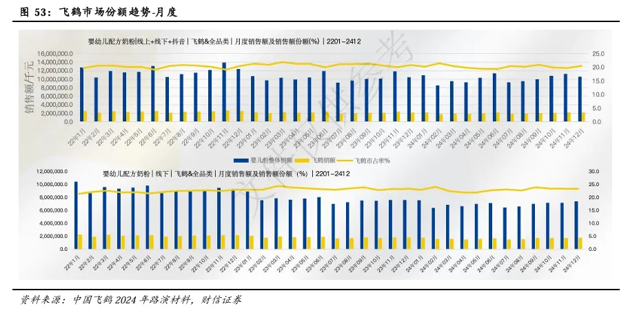 作为行业龙头,飞鹤奶粉的市占率在缓慢地稳步提升。2024年12月,飞鹤品牌全渠道份额为20.5%,线下市场占有率为23.1%。