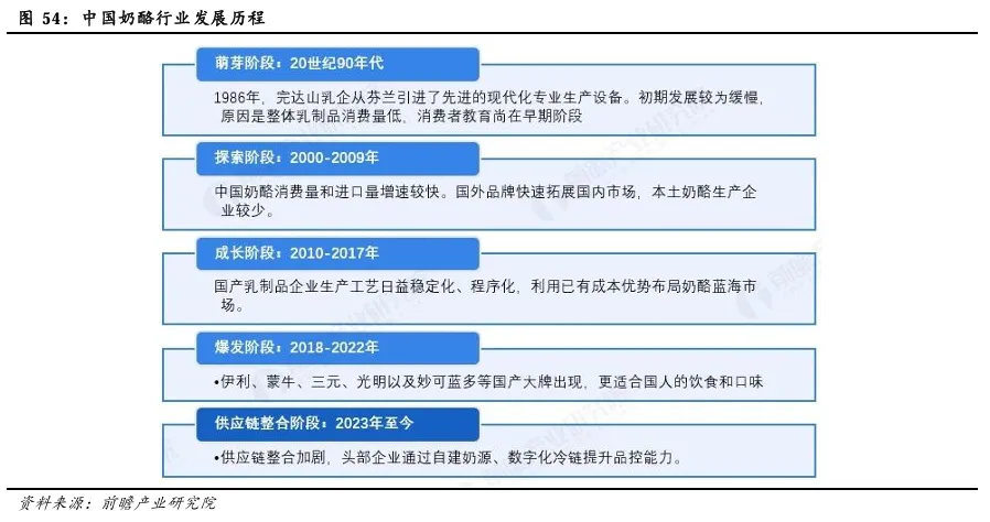 5)供应链整合阶段:2023年开始线下自营社区生鲜恢复,盒马等门店自提促进消费零售的发展,家庭烘焙场景带动原料奶酪销量增长。受健康消费理念驱动,低脂、高蛋白、功能性奶酪需求显著增长,供应链整合加剧,头部企业通过自建奶源、数字化冷链提升品控能力。