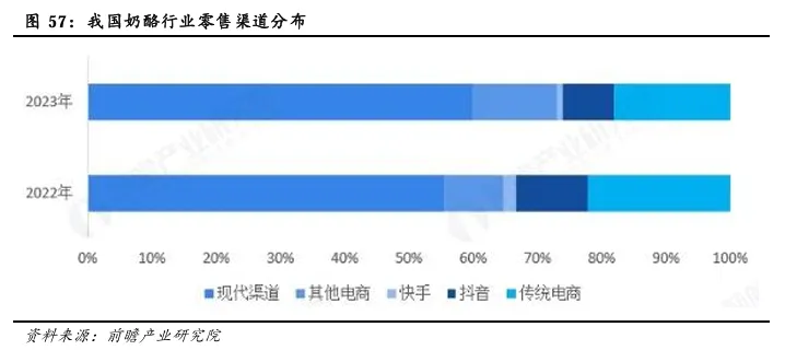 从渠道结构来看,零售渠道仍以线下为主。奶酪品类整体消费仍以线下渠道销售为主,2023年市场销售现代渠道占比高达60%,相比2022年提升5%,现代渠道,即大型商超、大型连锁商超的销售通路。传统电商、内容电商等线上渠道均在奶酪销售上逐年递减。