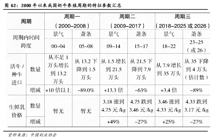 具体到国内供给的周期来看,2000年以来大致经历了3个周期,每个周期的平均时间跨度长达8~9年,每个周期可划分为4~5年“景气”+3~4年“萧条(或调整)”两个阶段,周期的拐点允许1年的时间容错。周期性波动最典型的特征参数就是进口种用牛的周期性变化(反映扩建产能的积极性)、生鲜乳价格的波动(反映养殖效益变化)等。
