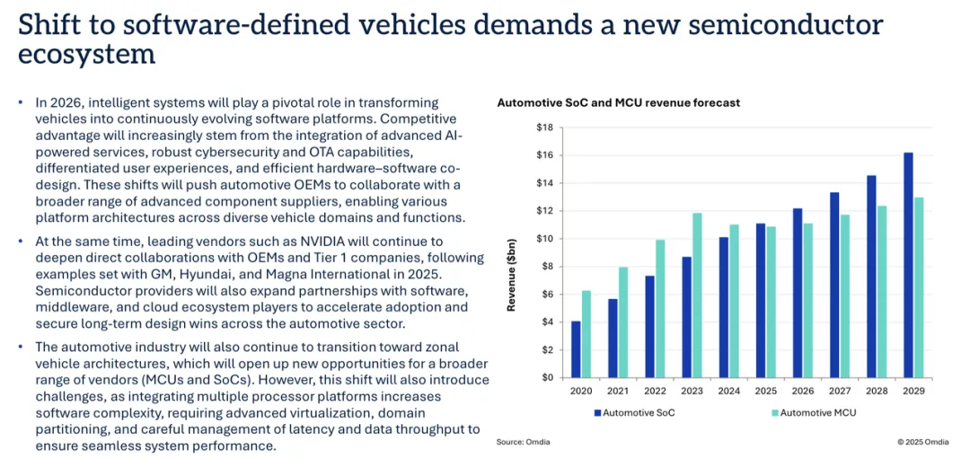 软件定义汽车视为 2026 年前后的关键转折,整车竞争优势逐渐转向人工智能服务能力、网络安全水平、OTA 能力以及软硬件协同效率。推动了半导体生态的重构。