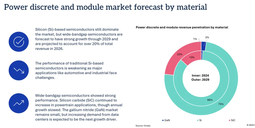 在功率分立器件与模块部分,硅基半导体在可预见的未来仍将占据主导地位,但宽禁带半导体的渗透率将持续提升,尤其是在 2026–2029 年期间。