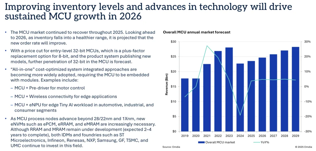 工艺节点的推进以及新型嵌入式非易失性存储器的研发,也体现出 MCU 对性能与可靠性的更高要求。头部厂商通过并购强化 AI、网络和软件能力,MCU 竞争已从单一芯片转向整体解决方案能力。