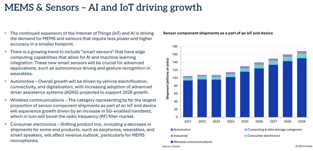 MEMS 与传感器增长的核心动力仍来自物联网与人工智能的持续扩张,终端设备数量增加以及应用复杂度提升,市场对低功耗、高精度、小尺寸传感器的需求不断增强。