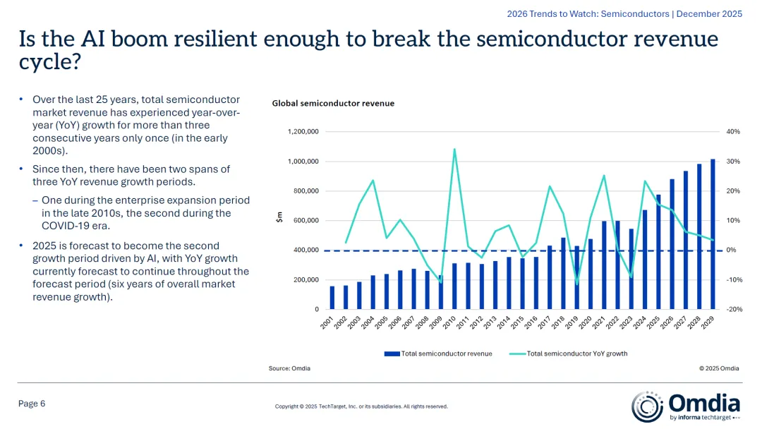 当前态势:2025年被预测为AI推动的新一轮增长起点,且可能持续六年,有望打破传统周期性波动规律;核心表现:数据中心服务器(特别是AI相关基础设施)成为主要驱动力,带动GPU、逻辑ASSP/ASIC、高带宽内存 (HBM)、电源管理IC等领域的历史性需求。