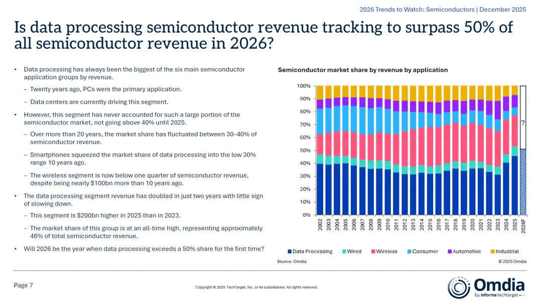 过去25年的半导体营收同比增速,突出了“非常态”的AI增长时期。AI有望支撑未来六年的连续增长,这在历史上极为罕见。1.2 数据处理应用占比首次逼近50%数据处理(以PC和后来的数据中心为主)一直是半导体最大的应用领域,但份额长期在30%-40%之间;- 转折点:2025年,该领域份额已达到约46%,较2023年增长超过2000亿美元;- 2026预测:数据处理有望首次突破50%大关,成为真正主导半导体市场的应用类别;