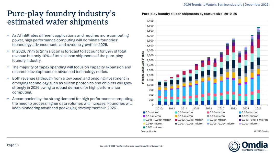 重点厂商动向:- SK海力士、三星、美光:聚焦HBM与先进DRAM,投资TSV、混合键合、次1nm工艺、以及新建大型晶圆厂;- 非存储类IDM:受地缘政治与关税不确定性影响,MCU、模拟与分立器件Capex面临缩减压力;2.2 先进制程推动代工收入增长- 技术节点趋势:2026年,7nm至2nm制程将贡献纯代工厂59%的营收,但仅占10%的晶圆出货量;