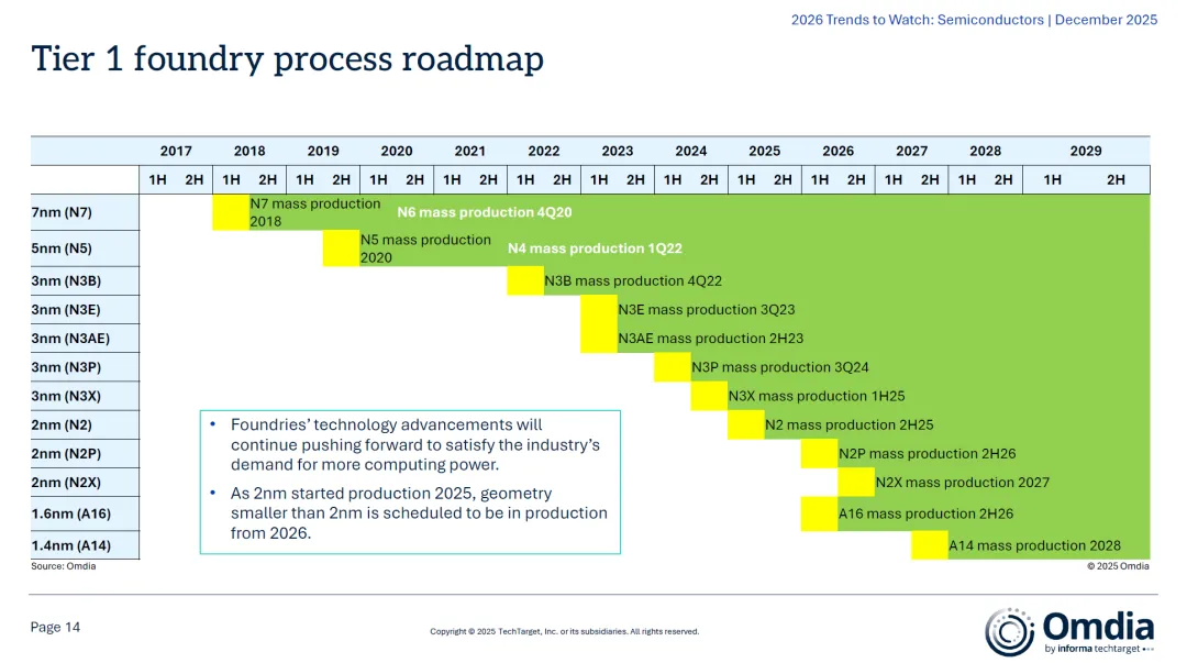 - 先进封装与异构集成:硅光子、芯粒(chiplets)等新兴技术需求强劲,推动封装技术持续演进;- 制程路线图:从7nm(2018量产)一路推进至1.4nm(预计2028年),2nm将在2025启动,2026进入量产;