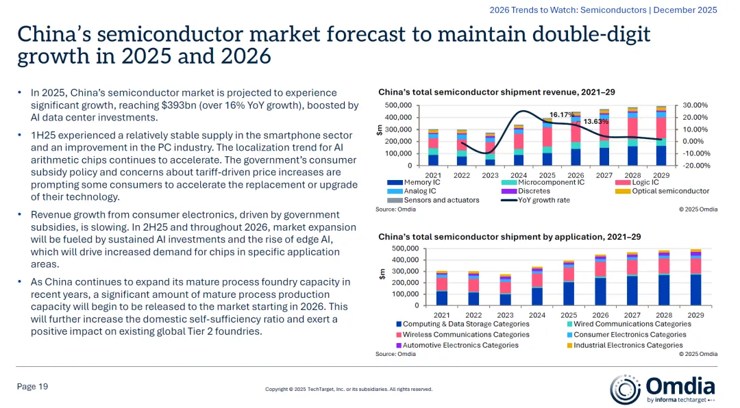 三、中国半导体市场:边缘AI与成熟制程崛起3.1 市场规模与增长- 2025年预测:中国半导体市场规模将达到3930亿美元,同比增长超16%,主要受AI数据中心投资拉动;