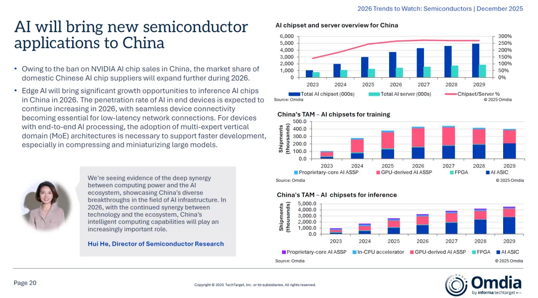 - 2026年驱动:边缘AI与持续AI投资将推动特定应用芯片需求,如推理芯片、专用加速器等;- 成熟制程释放:2026年起,中国大量成熟制程产能将投放市场,提高自给率,并对全球二线代工厂产生积极影响;3.2 国产AI芯片与存储机遇- AI芯片:由于美国对NVIDIA芯片的禁售,国产AI芯片供应商市占率将在2026年进一步提升;- 存储市场:AI推动DRAM需求进入上升周期,NAND价格预计2026年上涨40%;- 技术方向:QLC SSD与HAMR技术逐步渗透,但HDD在近线存储中仍将保持主导地位(成本优势显著);