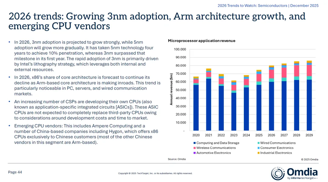 四、关键技术趋势与细分领域亮点4.1 CPU与MCU:3nm普及、Arm架构崛起- 3nm制程:2026年3nm将快速普及,其渗透速度远超5nm(3nm首年即超越5nm四年才达到的10%节点);- 架构变迁:x86份额持续下滑,Arm架构在PC、服务器与通信市场不断扩展;- 新兴CPU供应商:包括Ampere Computing及多家中国厂商(如Hygon,专注x86本土化);