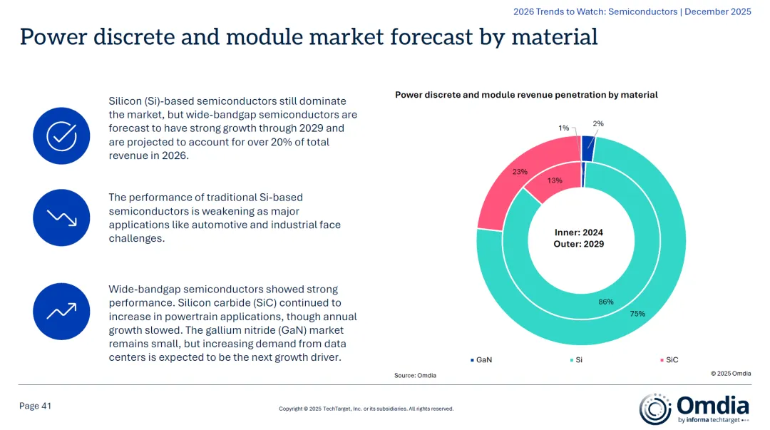 4.4 功率器件:宽禁带半导体崛起- 材料趋势:硅基器件仍占主流,但碳化硅(SiC)与氮化镓(GaN)增长迅猛;- 应用驱动:SiC主打电动车动力系统,GaN有望在数据中心领域爆发;
