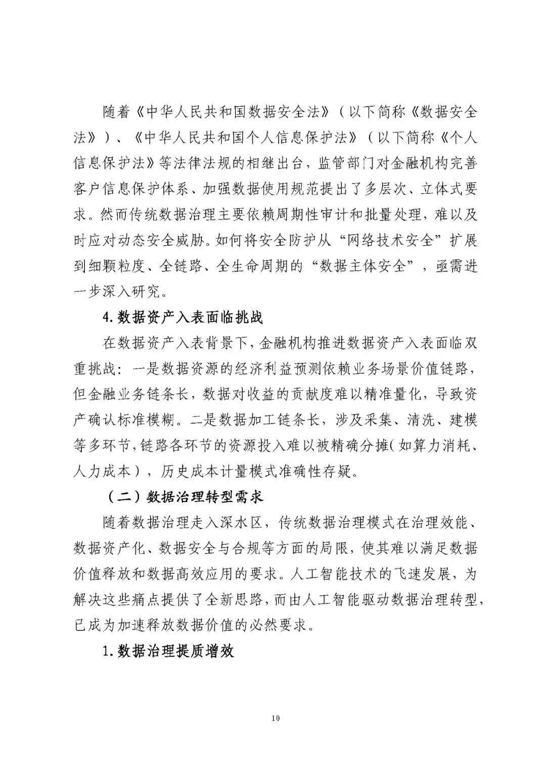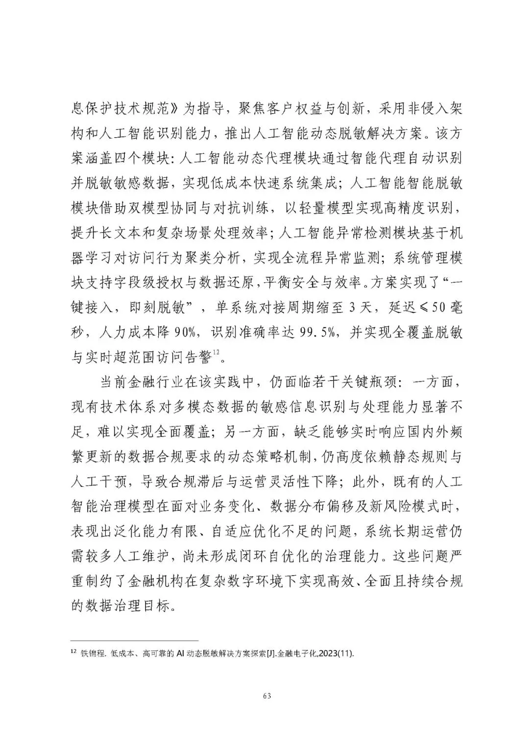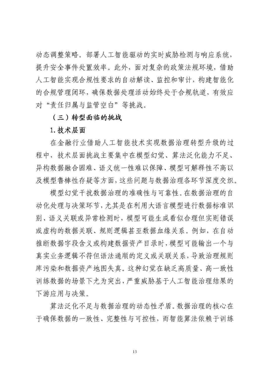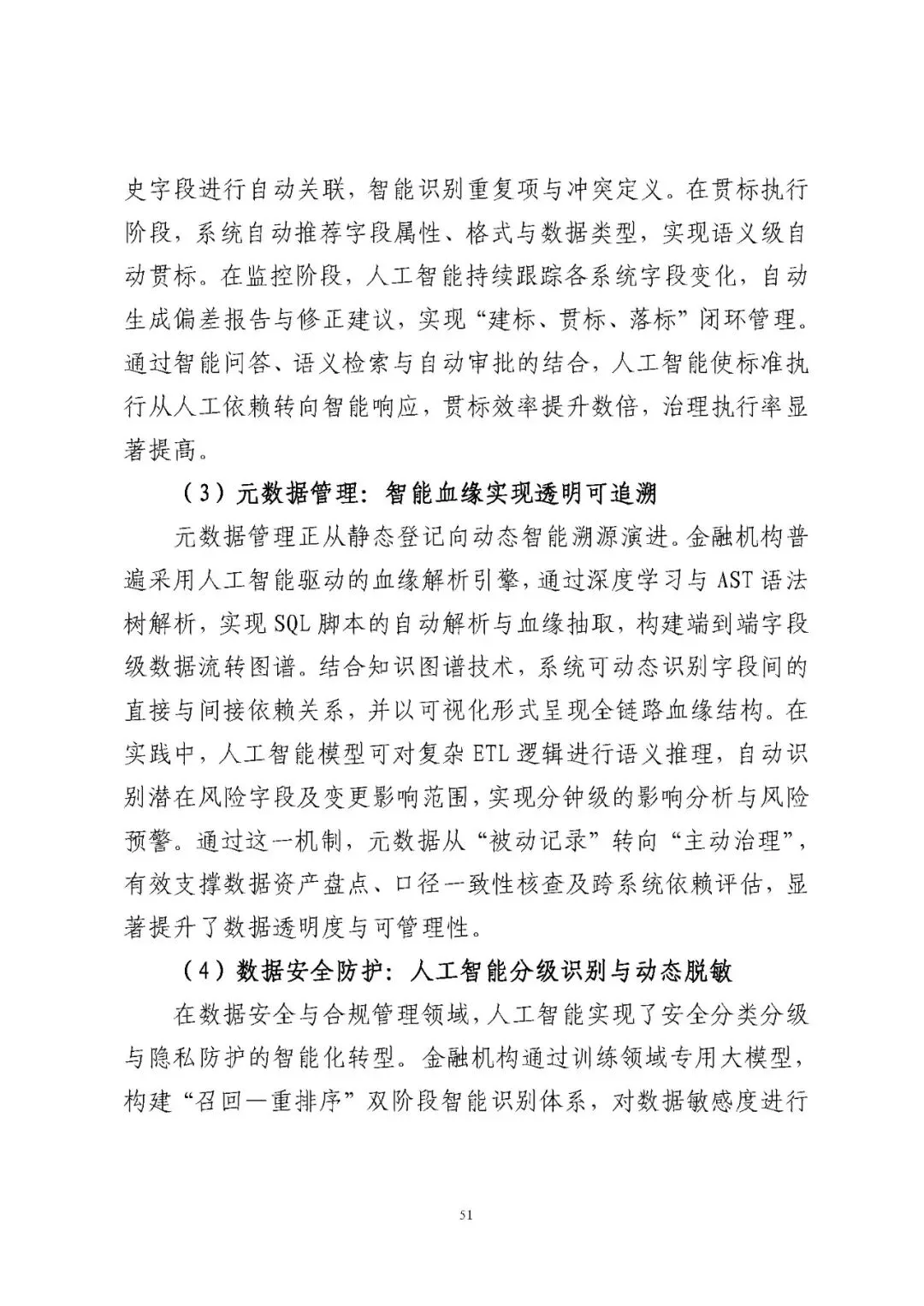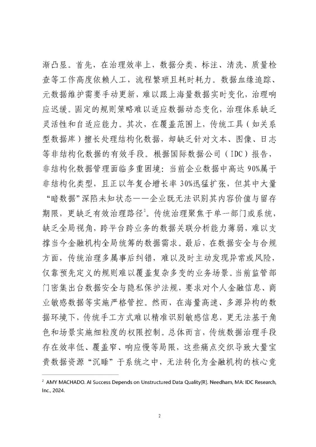 本报告提出了人工智能驱动数据治理的行业解决方案,聚焦数据质量提升、元数据管理、数据标准落地及安全合规等环节,深入梳理了自然语言处理、知识图谱等关键技术的应用路径,通过多技术融合构建从智能感知到自动决策的治理闭环。报告创新设计了“AI筑基、深化赋能、价值跃升”的阶段性实施路径及覆盖数据治理各领域的应用场景框架,通过行业实践案例验证了在提升数据贯标效率、安全合规管理等方面的显著成效,为金融机构提供了清晰可行、分步落地的行动指南,以及分层级、差异化的智能化转型路径参考。