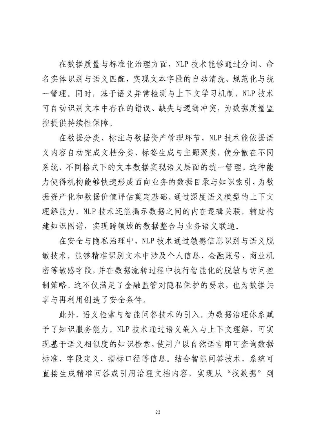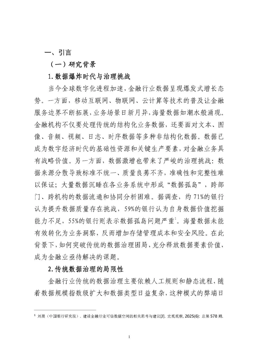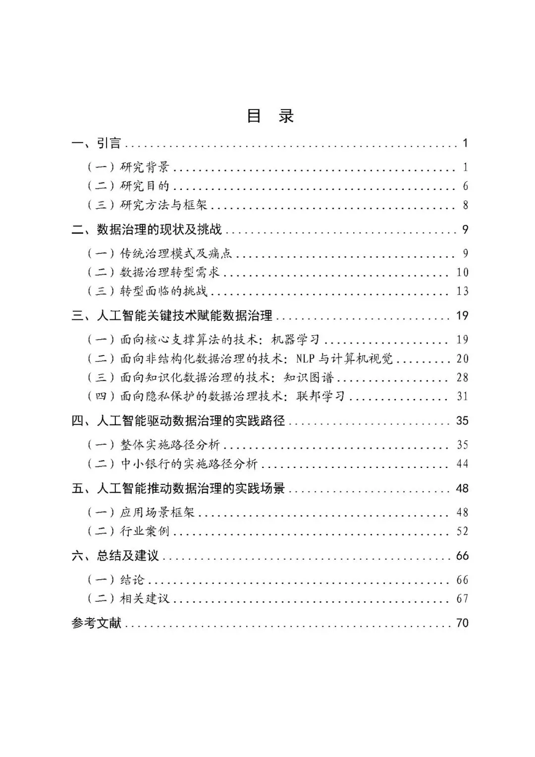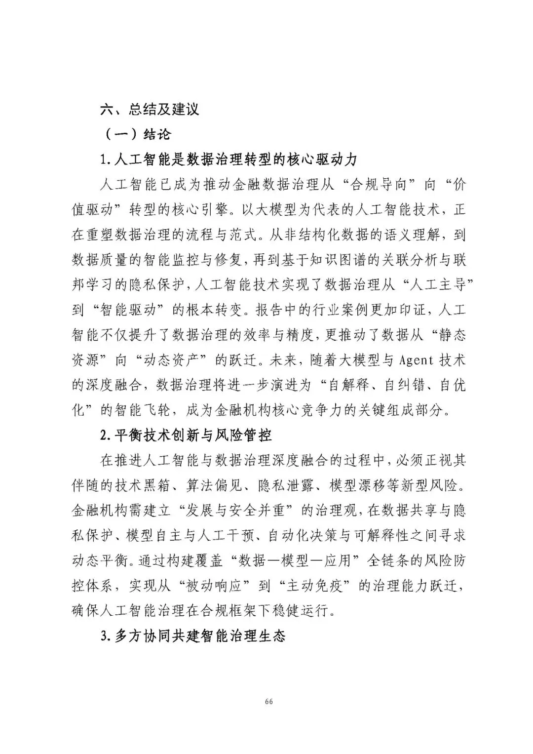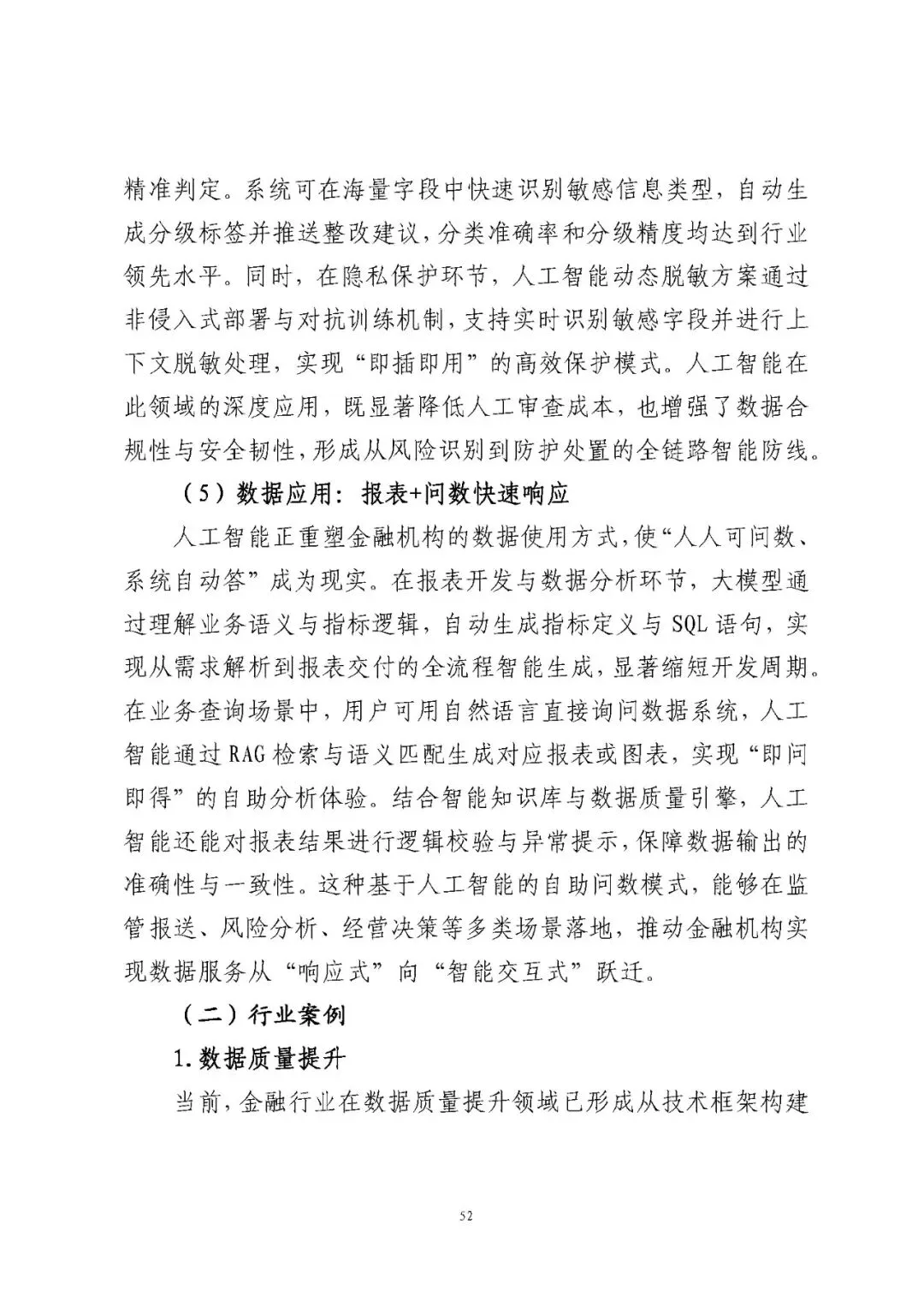 本报告提出了人工智能驱动数据治理的行业解决方案,聚焦数据质量提升、元数据管理、数据标准落地及安全合规等环节,深入梳理了自然语言处理、知识图谱等关键技术的应用路径,通过多技术融合构建从智能感知到自动决策的治理闭环。报告创新设计了“AI筑基、深化赋能、价值跃升”的阶段性实施路径及覆盖数据治理各领域的应用场景框架,通过行业实践案例验证了在提升数据贯标效率、安全合规管理等方面的显著成效,为金融机构提供了清晰可行、分步落地的行动指南,以及分层级、差异化的智能化转型路径参考。