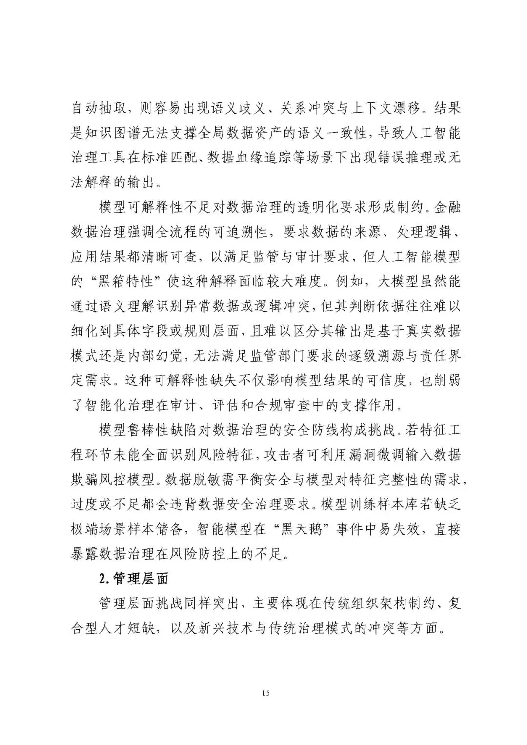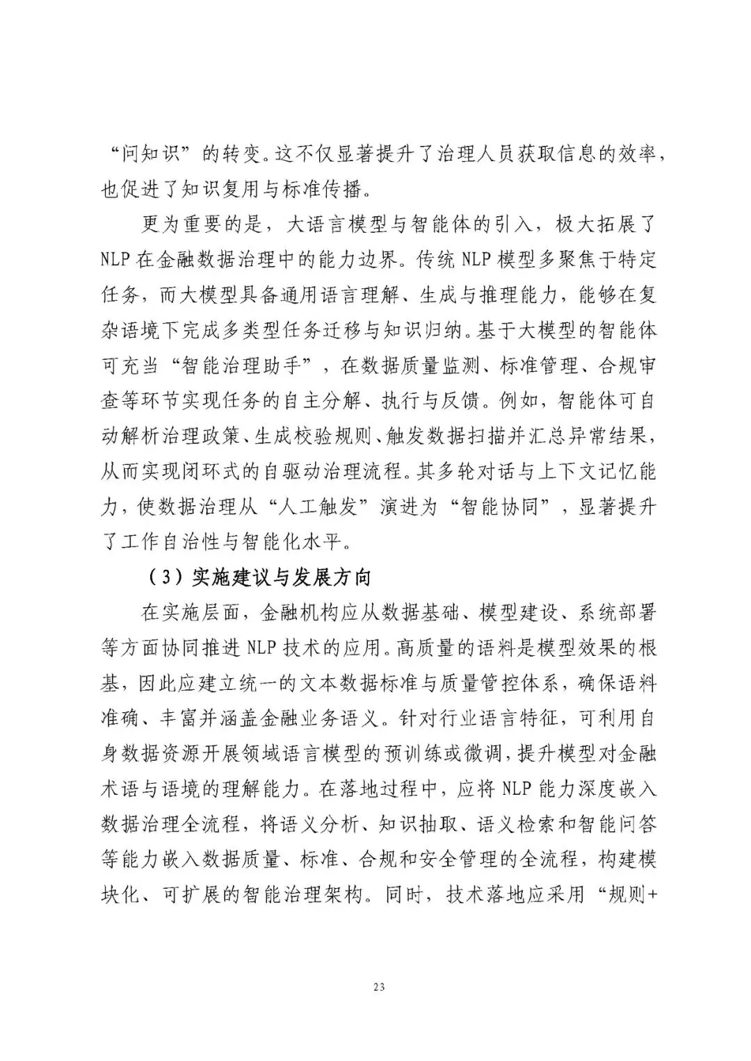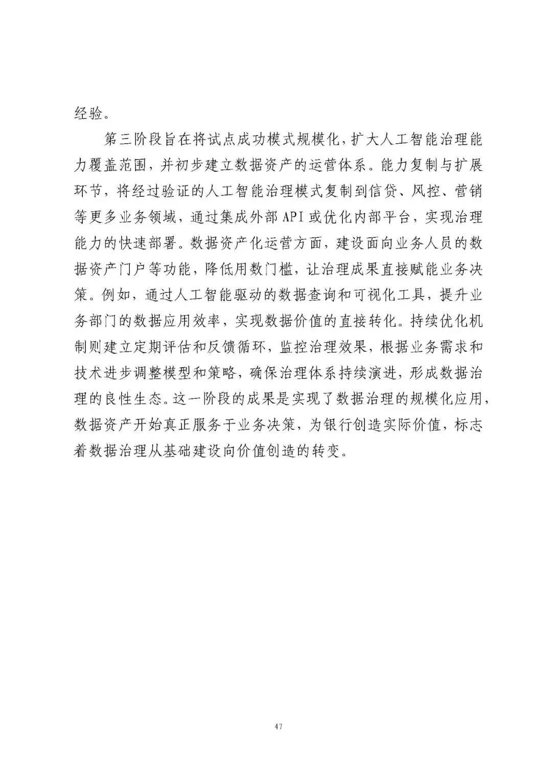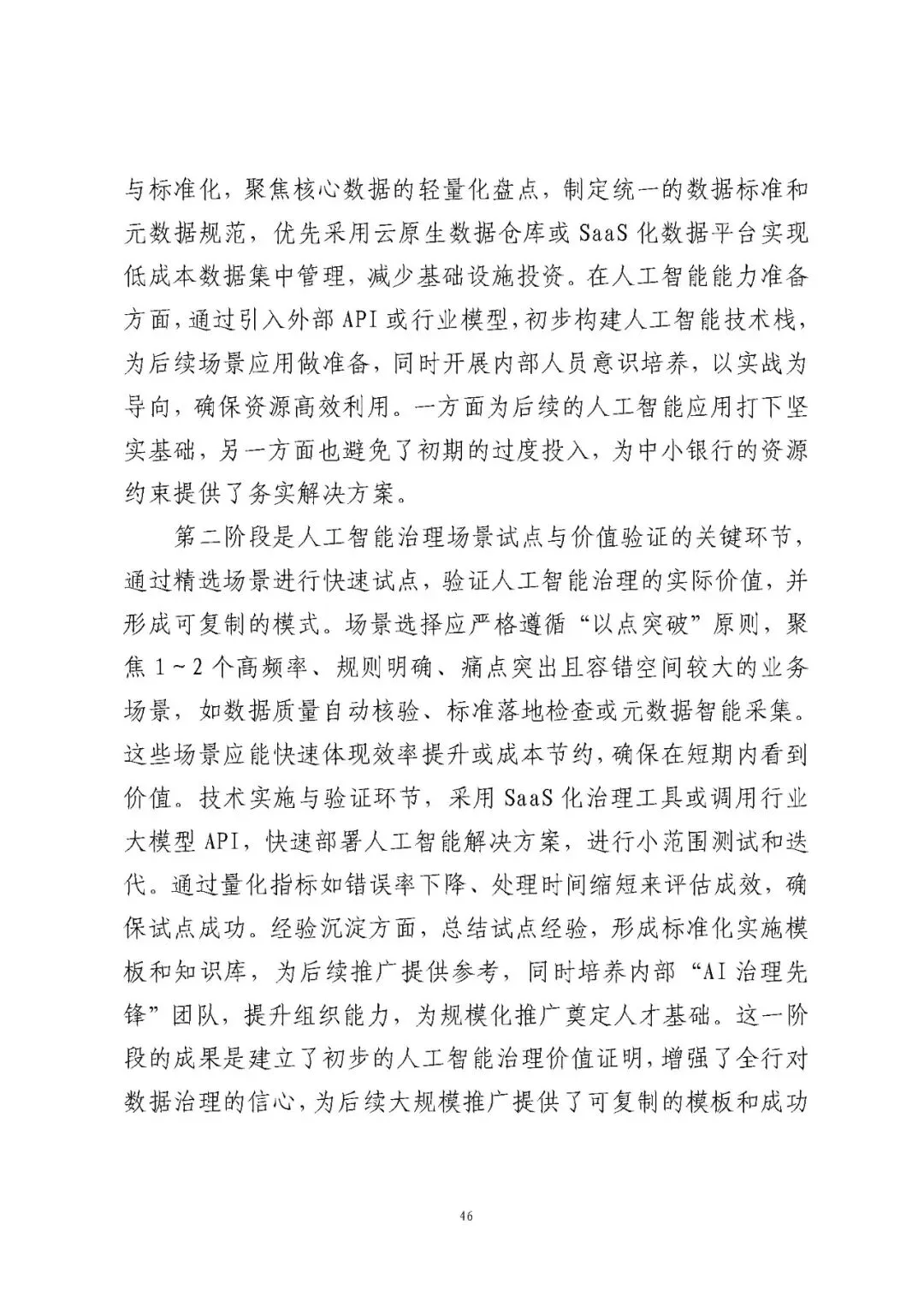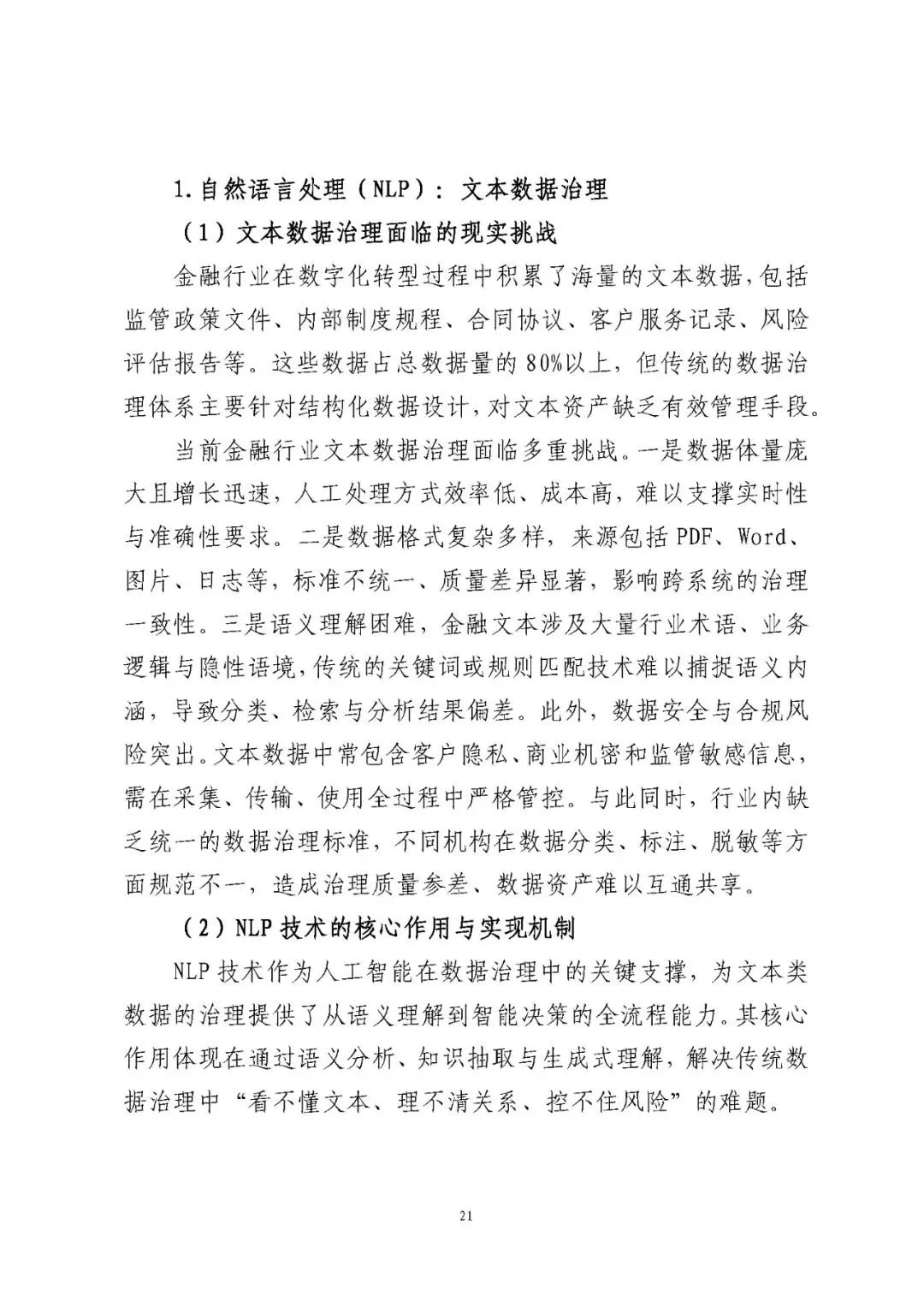 本报告提出了人工智能驱动数据治理的行业解决方案,聚焦数据质量提升、元数据管理、数据标准落地及安全合规等环节,深入梳理了自然语言处理、知识图谱等关键技术的应用路径,通过多技术融合构建从智能感知到自动决策的治理闭环。报告创新设计了“AI筑基、深化赋能、价值跃升”的阶段性实施路径及覆盖数据治理各领域的应用场景框架,通过行业实践案例验证了在提升数据贯标效率、安全合规管理等方面的显著成效,为金融机构提供了清晰可行、分步落地的行动指南,以及分层级、差异化的智能化转型路径参考。