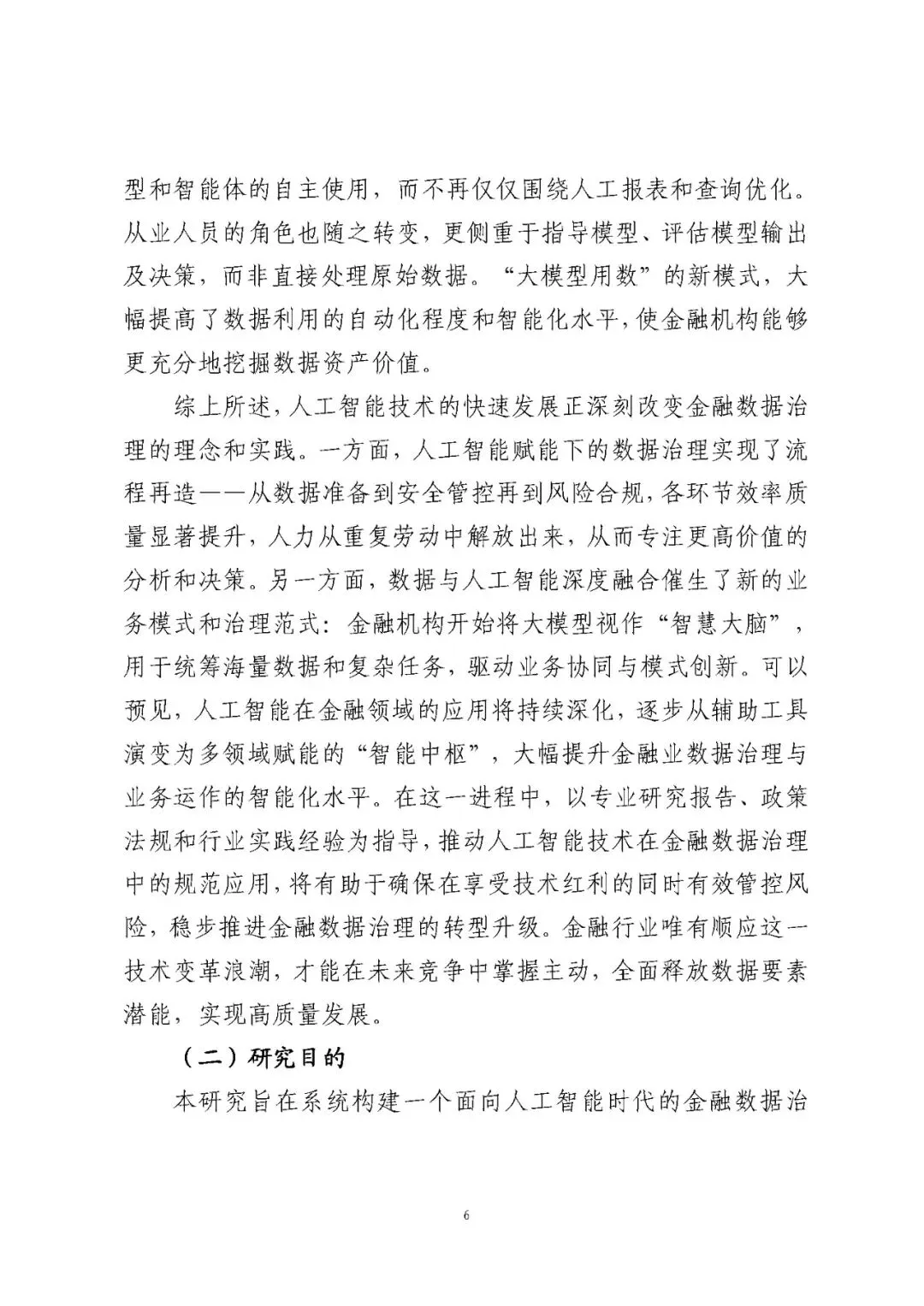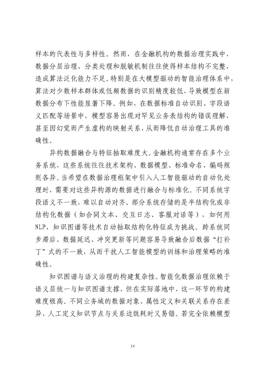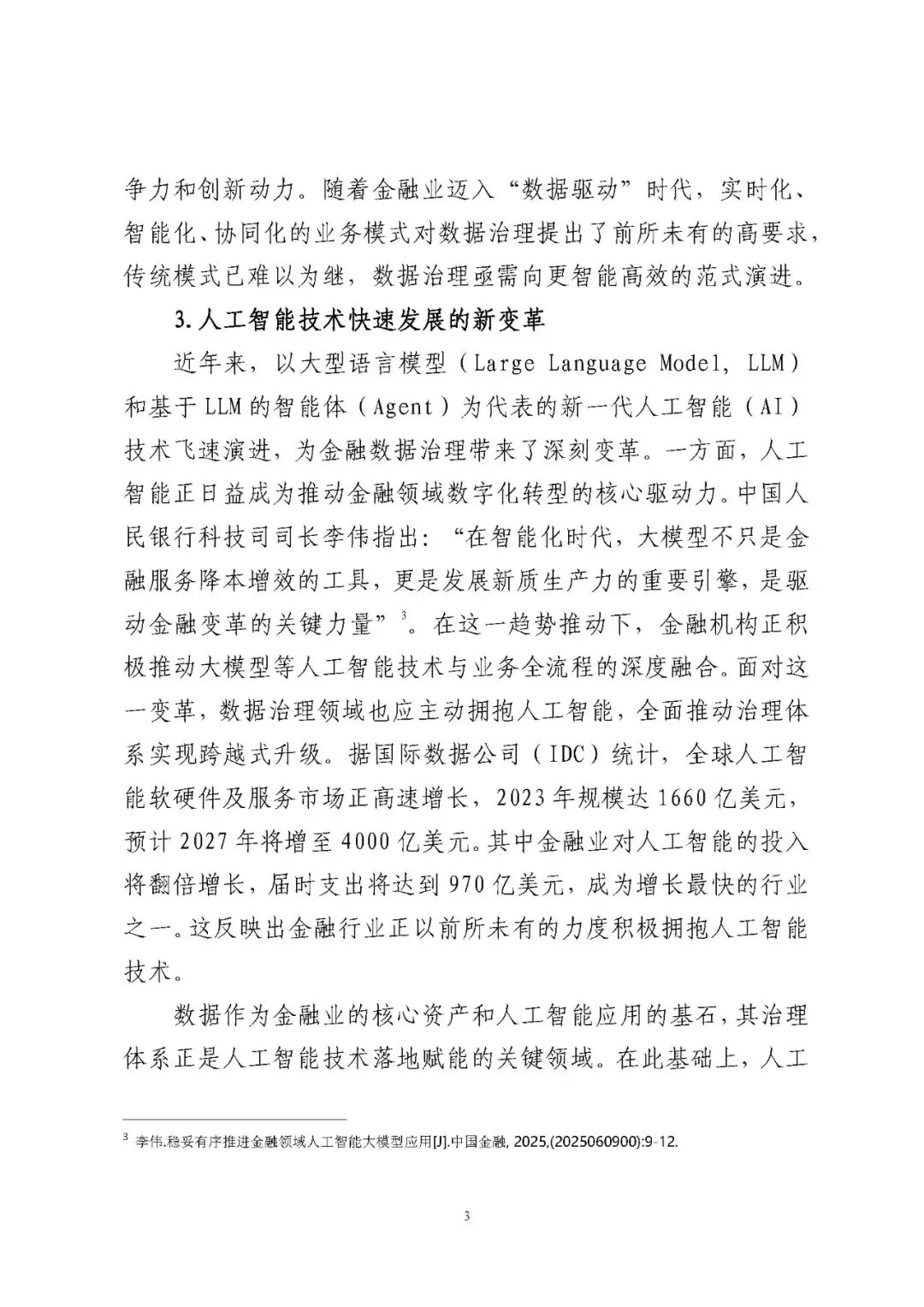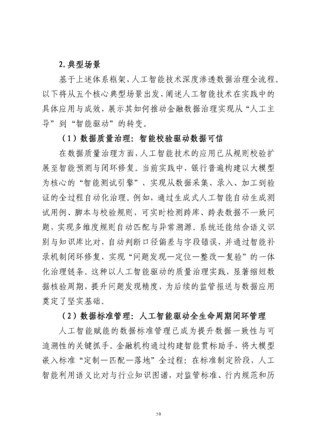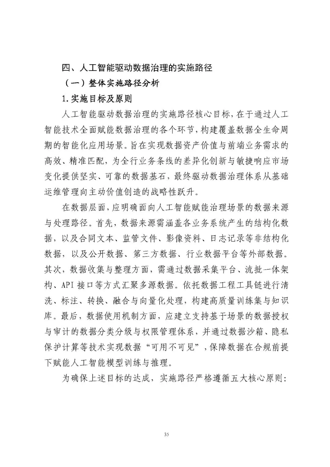 本报告提出了人工智能驱动数据治理的行业解决方案,聚焦数据质量提升、元数据管理、数据标准落地及安全合规等环节,深入梳理了自然语言处理、知识图谱等关键技术的应用路径,通过多技术融合构建从智能感知到自动决策的治理闭环。报告创新设计了“AI筑基、深化赋能、价值跃升”的阶段性实施路径及覆盖数据治理各领域的应用场景框架,通过行业实践案例验证了在提升数据贯标效率、安全合规管理等方面的显著成效,为金融机构提供了清晰可行、分步落地的行动指南,以及分层级、差异化的智能化转型路径参考。