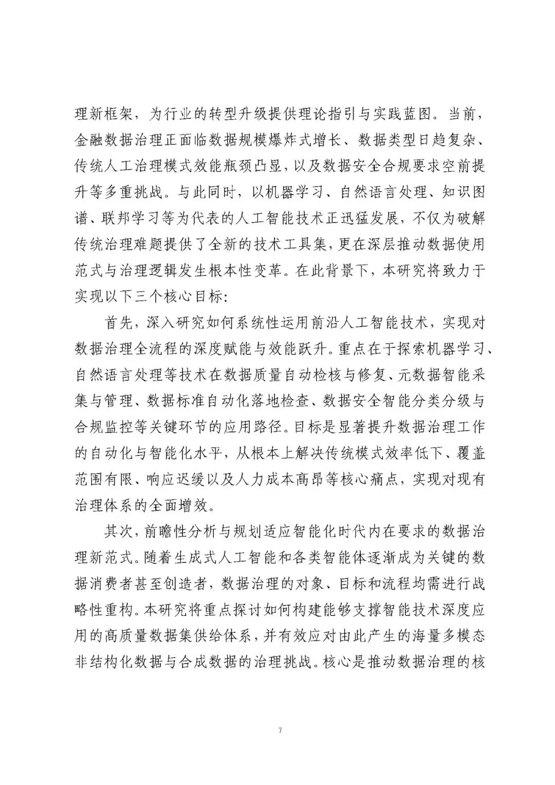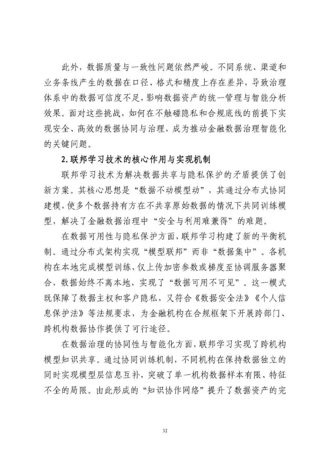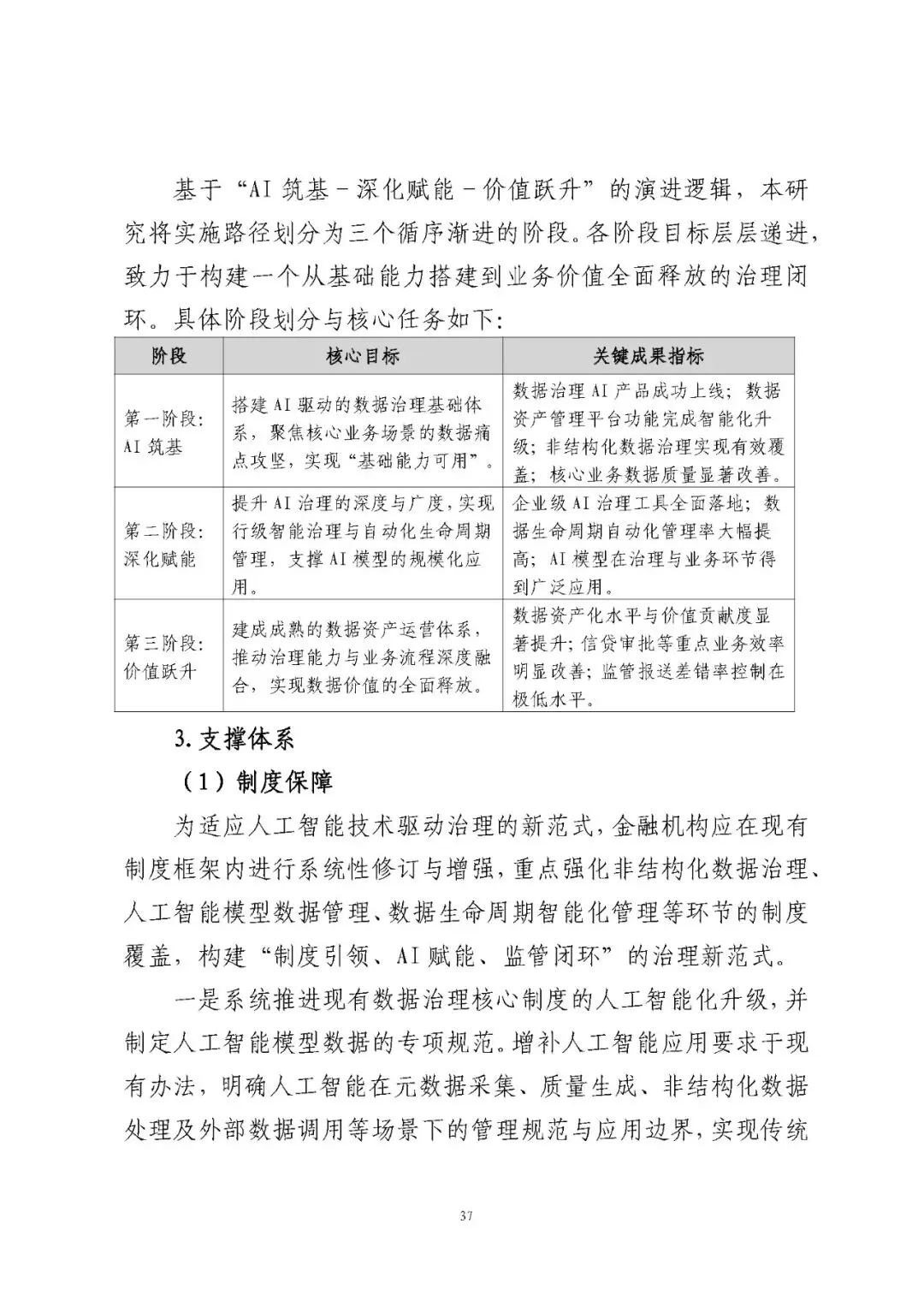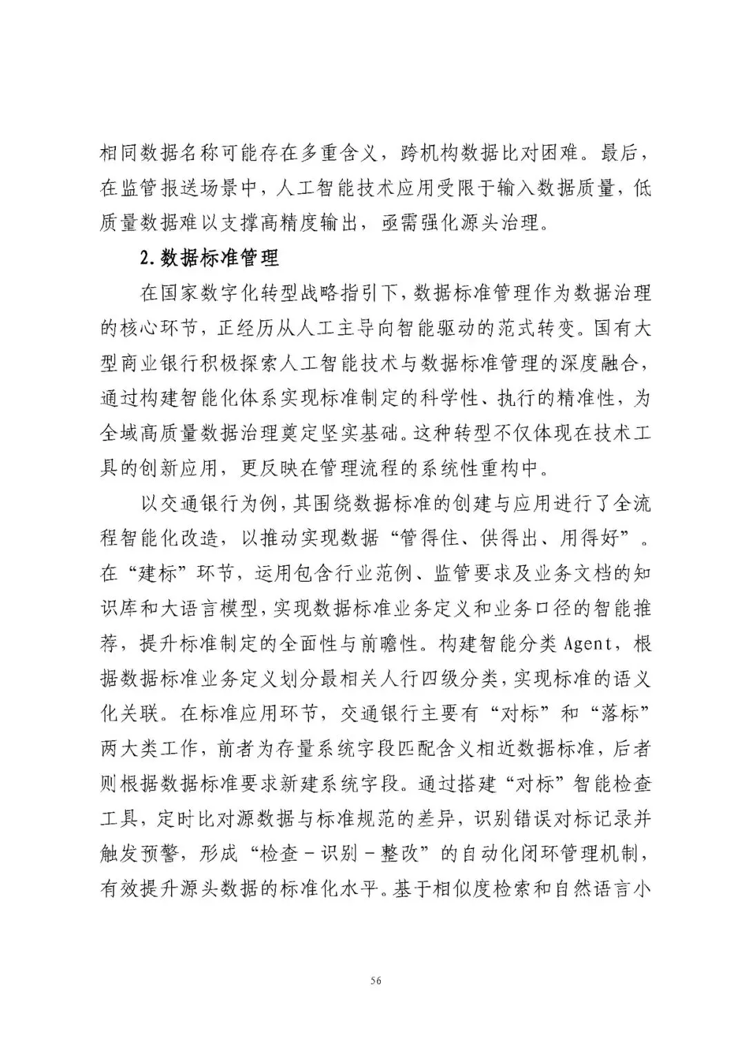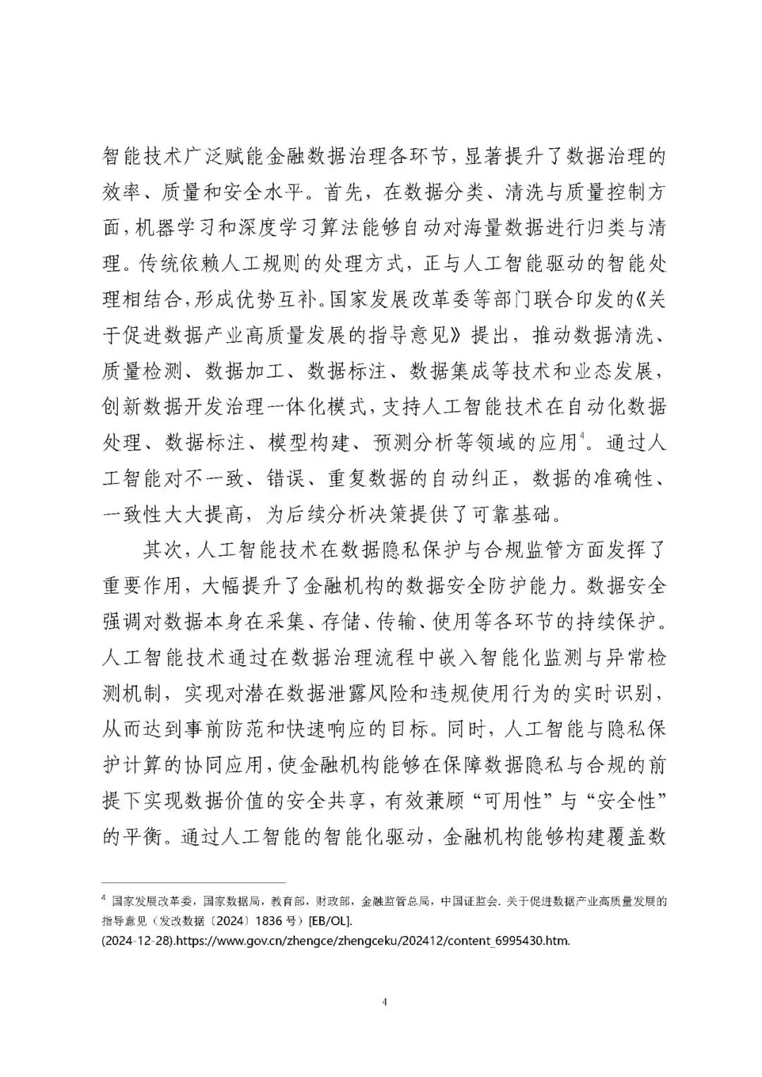 本报告提出了人工智能驱动数据治理的行业解决方案,聚焦数据质量提升、元数据管理、数据标准落地及安全合规等环节,深入梳理了自然语言处理、知识图谱等关键技术的应用路径,通过多技术融合构建从智能感知到自动决策的治理闭环。报告创新设计了“AI筑基、深化赋能、价值跃升”的阶段性实施路径及覆盖数据治理各领域的应用场景框架,通过行业实践案例验证了在提升数据贯标效率、安全合规管理等方面的显著成效,为金融机构提供了清晰可行、分步落地的行动指南,以及分层级、差异化的智能化转型路径参考。