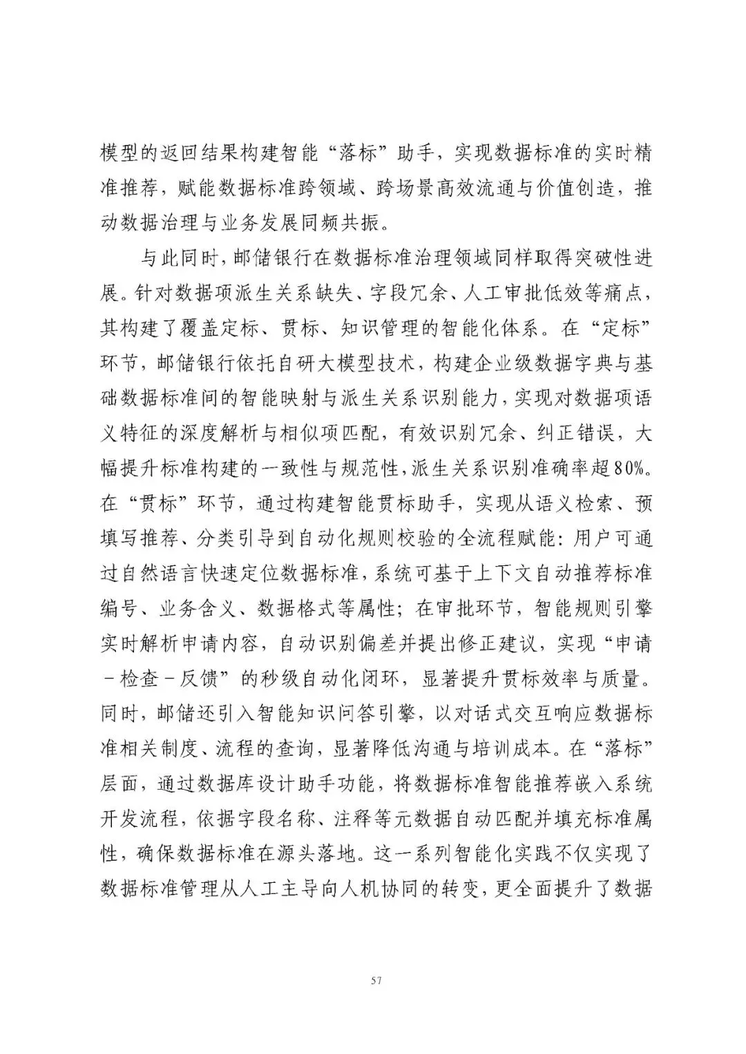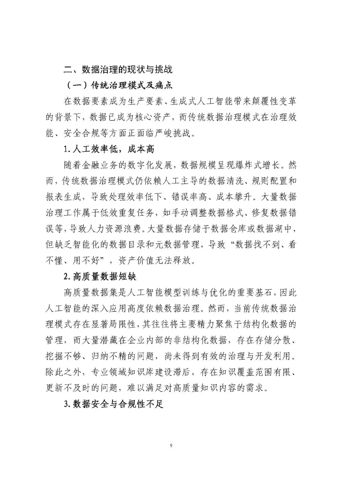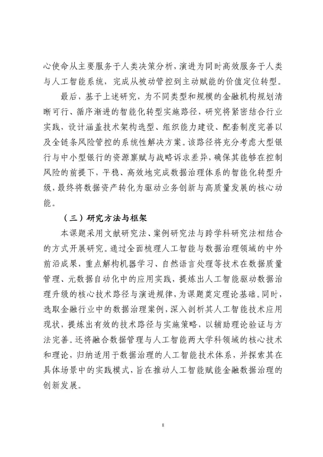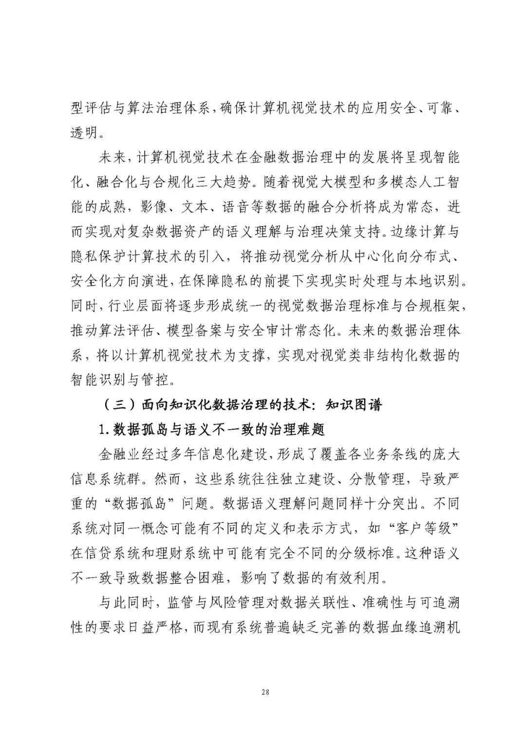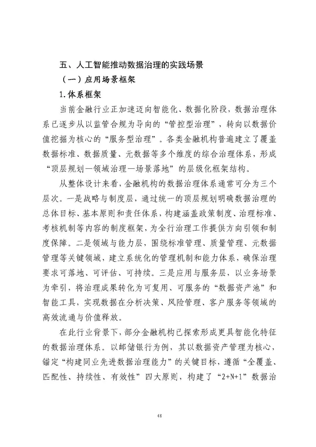 本报告提出了人工智能驱动数据治理的行业解决方案,聚焦数据质量提升、元数据管理、数据标准落地及安全合规等环节,深入梳理了自然语言处理、知识图谱等关键技术的应用路径,通过多技术融合构建从智能感知到自动决策的治理闭环。报告创新设计了“AI筑基、深化赋能、价值跃升”的阶段性实施路径及覆盖数据治理各领域的应用场景框架,通过行业实践案例验证了在提升数据贯标效率、安全合规管理等方面的显著成效,为金融机构提供了清晰可行、分步落地的行动指南,以及分层级、差异化的智能化转型路径参考。