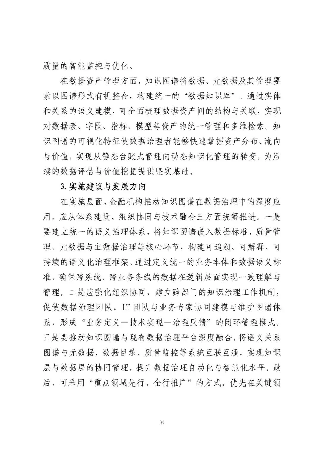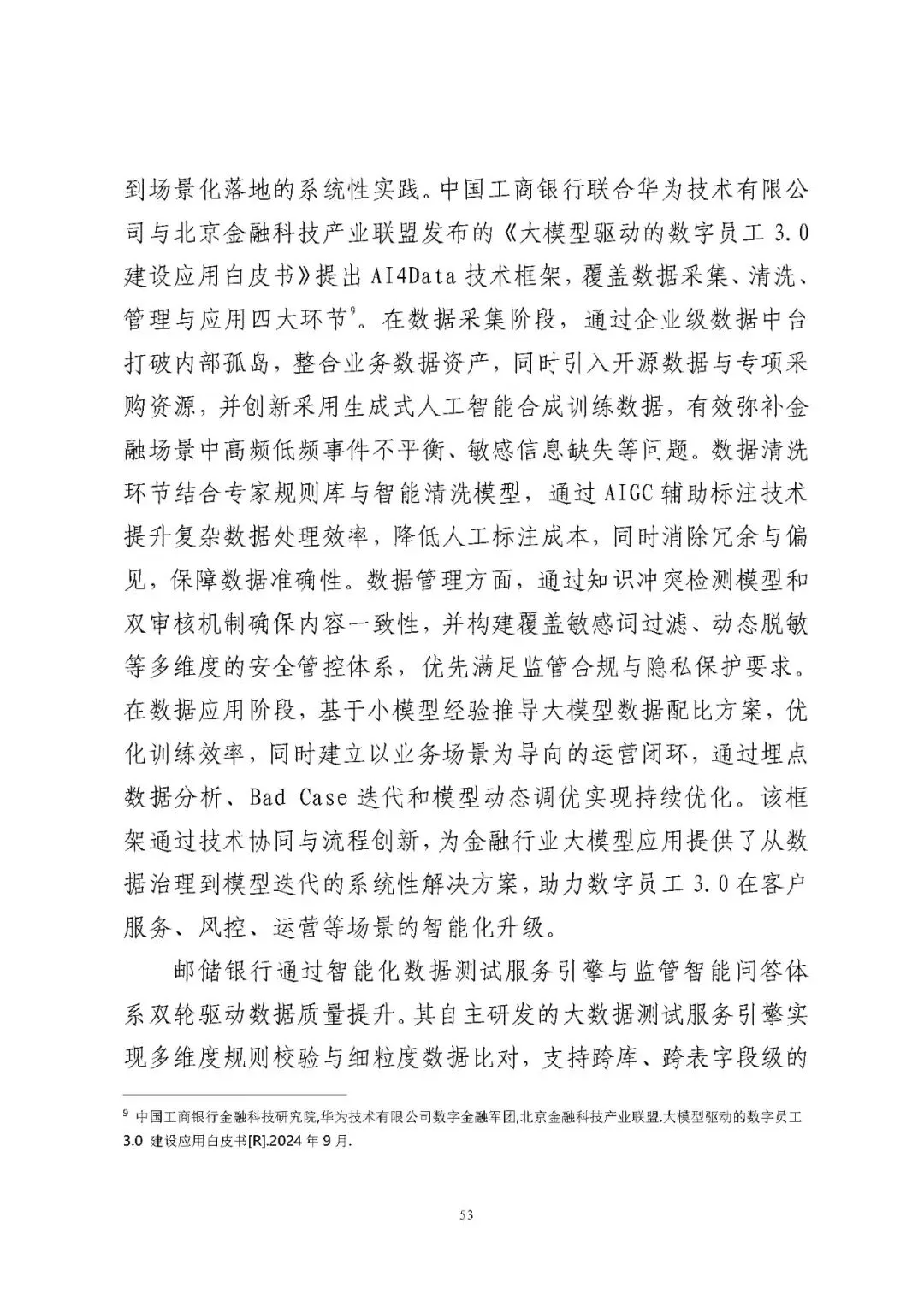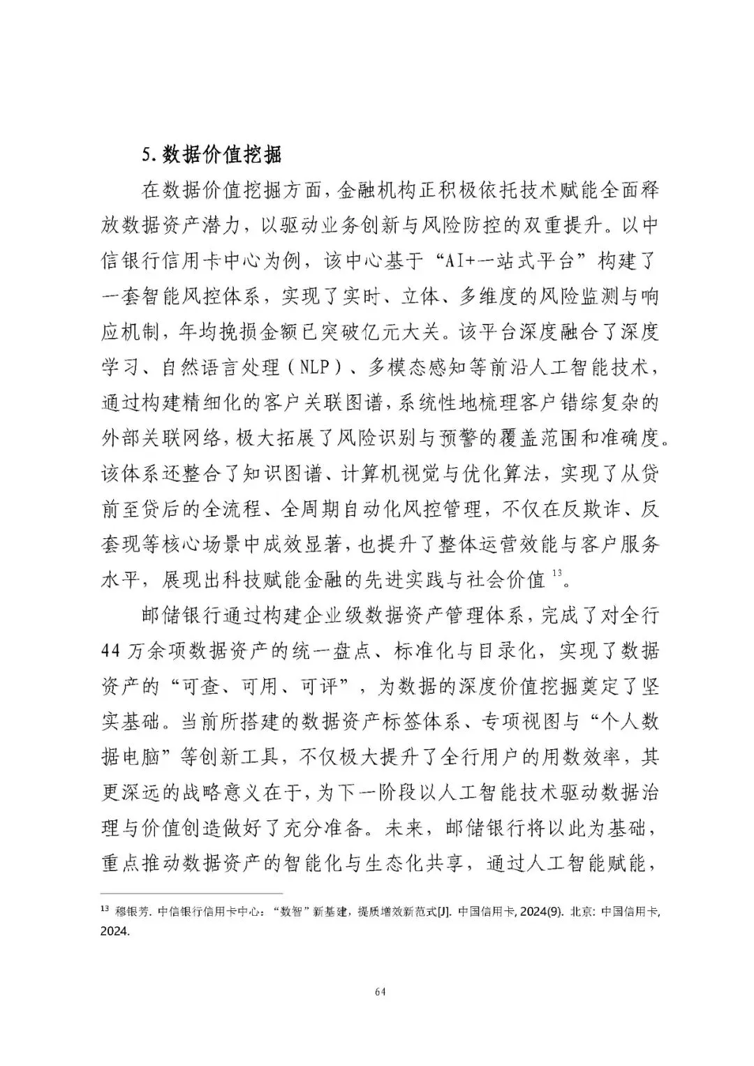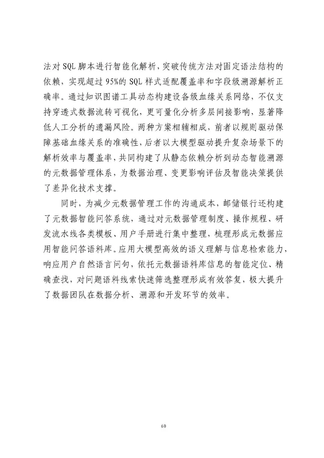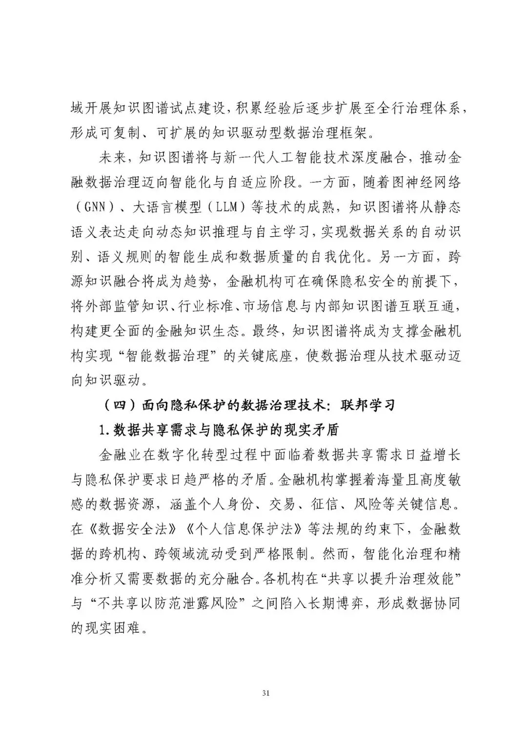 本报告提出了人工智能驱动数据治理的行业解决方案,聚焦数据质量提升、元数据管理、数据标准落地及安全合规等环节,深入梳理了自然语言处理、知识图谱等关键技术的应用路径,通过多技术融合构建从智能感知到自动决策的治理闭环。报告创新设计了“AI筑基、深化赋能、价值跃升”的阶段性实施路径及覆盖数据治理各领域的应用场景框架,通过行业实践案例验证了在提升数据贯标效率、安全合规管理等方面的显著成效,为金融机构提供了清晰可行、分步落地的行动指南,以及分层级、差异化的智能化转型路径参考。