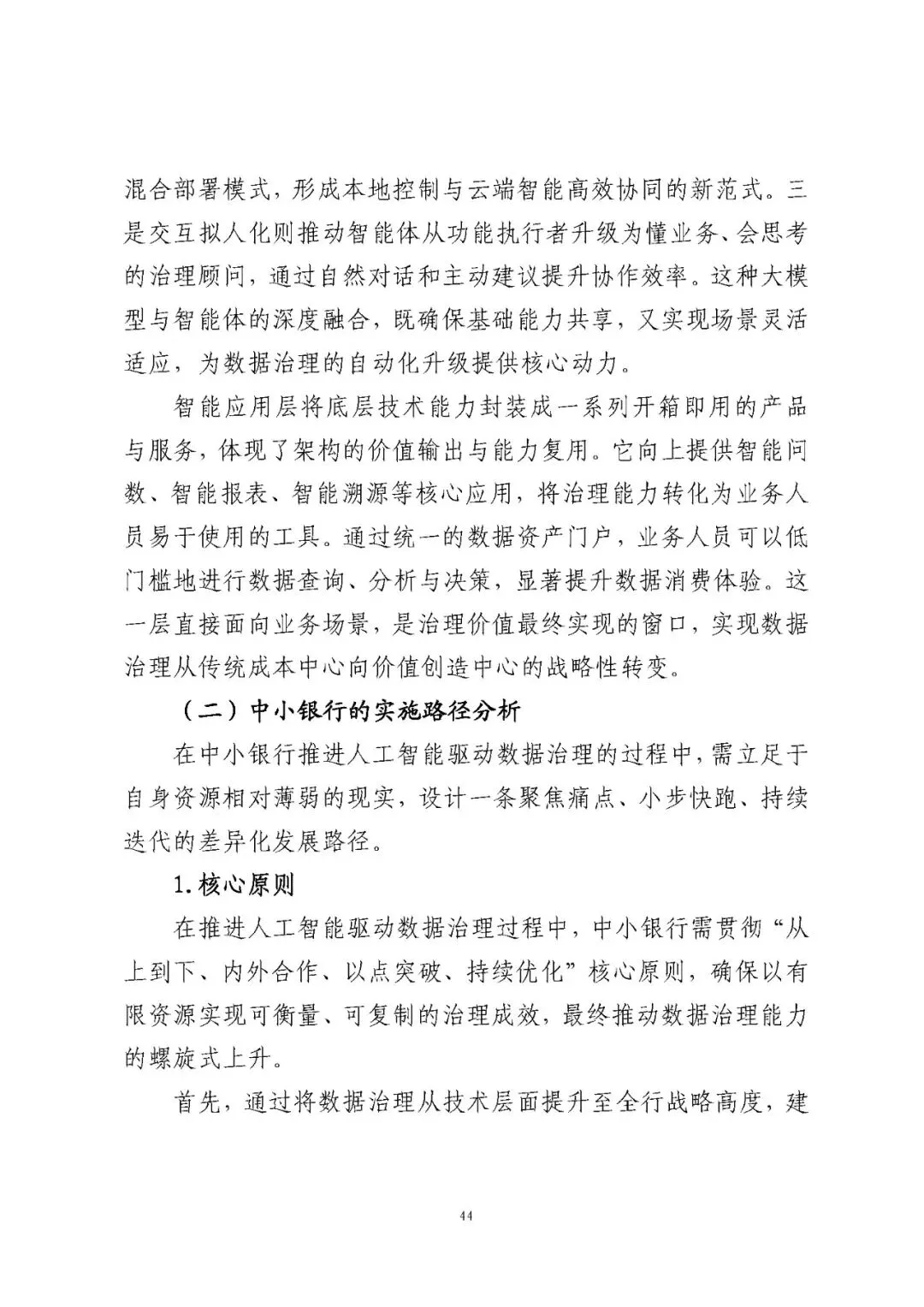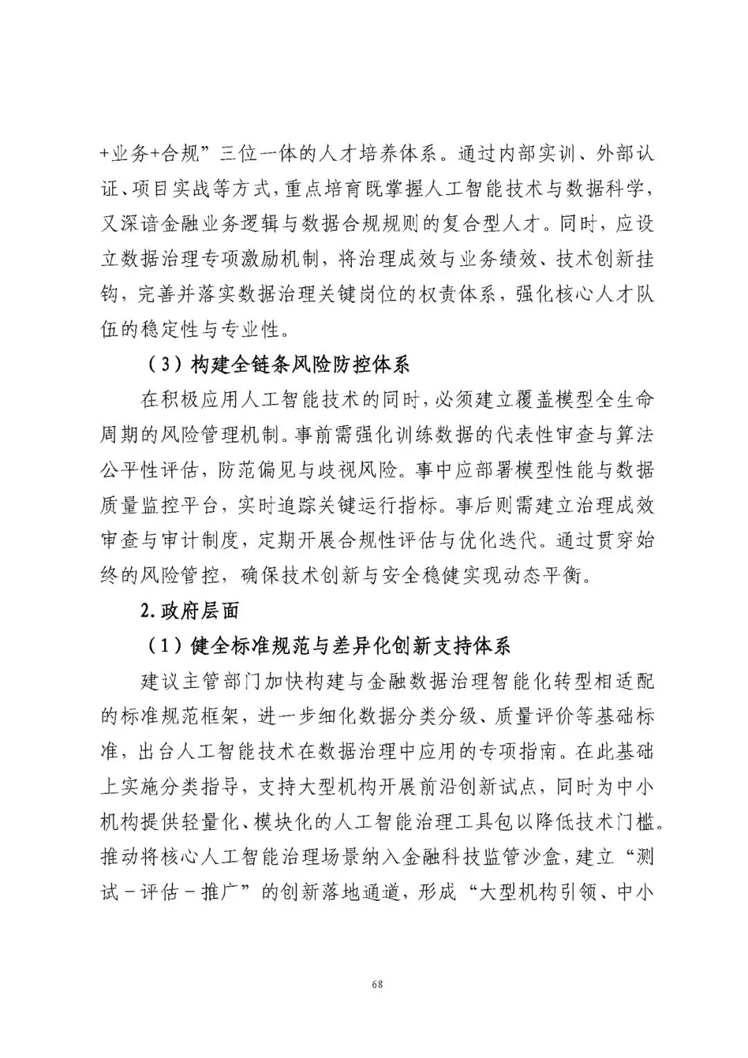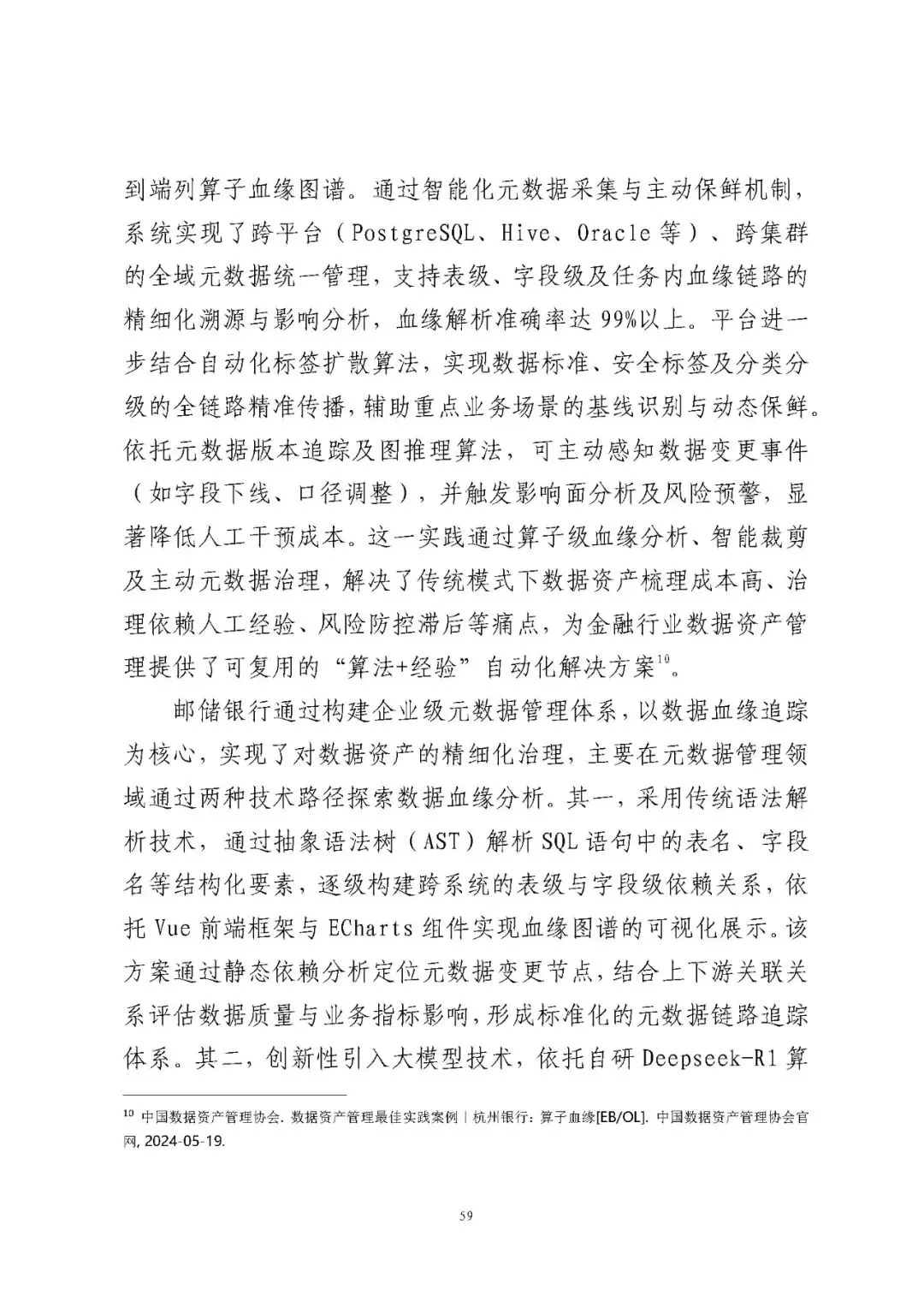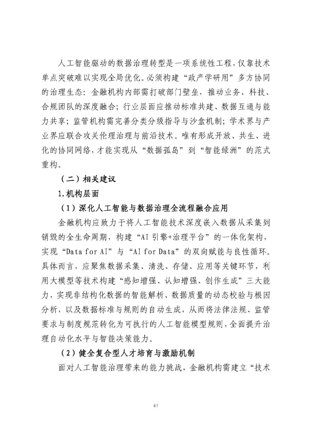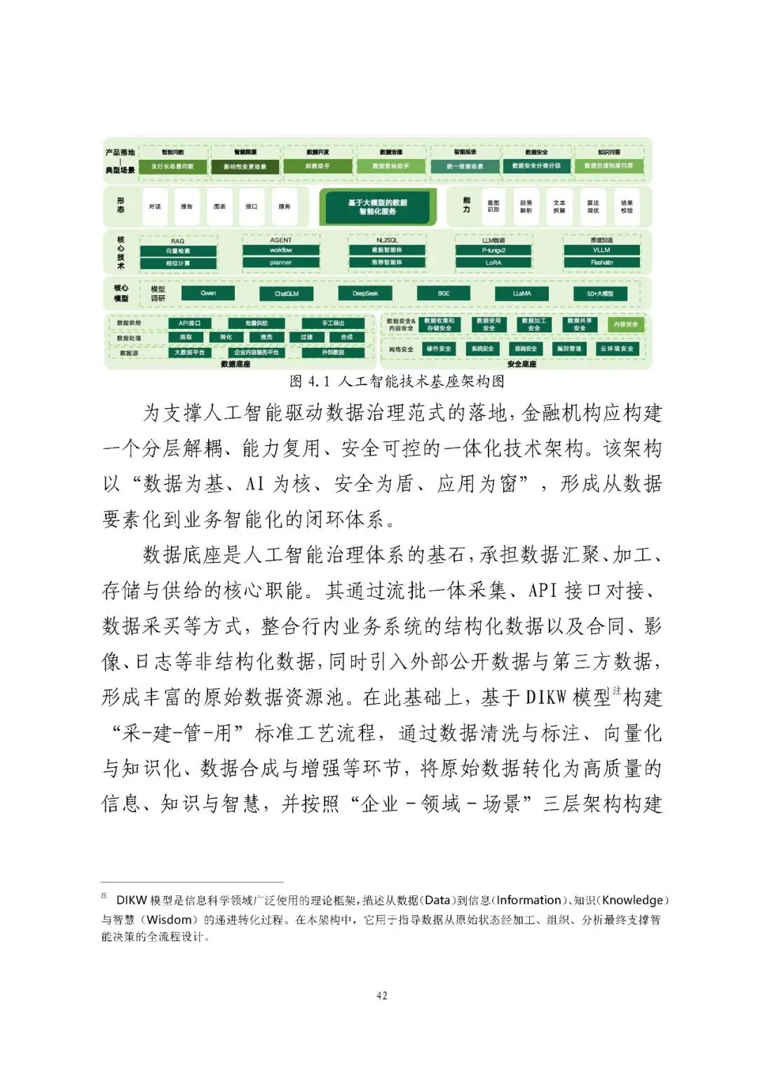 本报告提出了人工智能驱动数据治理的行业解决方案,聚焦数据质量提升、元数据管理、数据标准落地及安全合规等环节,深入梳理了自然语言处理、知识图谱等关键技术的应用路径,通过多技术融合构建从智能感知到自动决策的治理闭环。报告创新设计了“AI筑基、深化赋能、价值跃升”的阶段性实施路径及覆盖数据治理各领域的应用场景框架,通过行业实践案例验证了在提升数据贯标效率、安全合规管理等方面的显著成效,为金融机构提供了清晰可行、分步落地的行动指南,以及分层级、差异化的智能化转型路径参考。