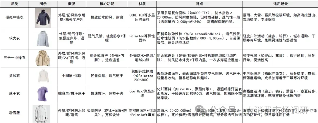 • 户外服饰主要品类功能性 :