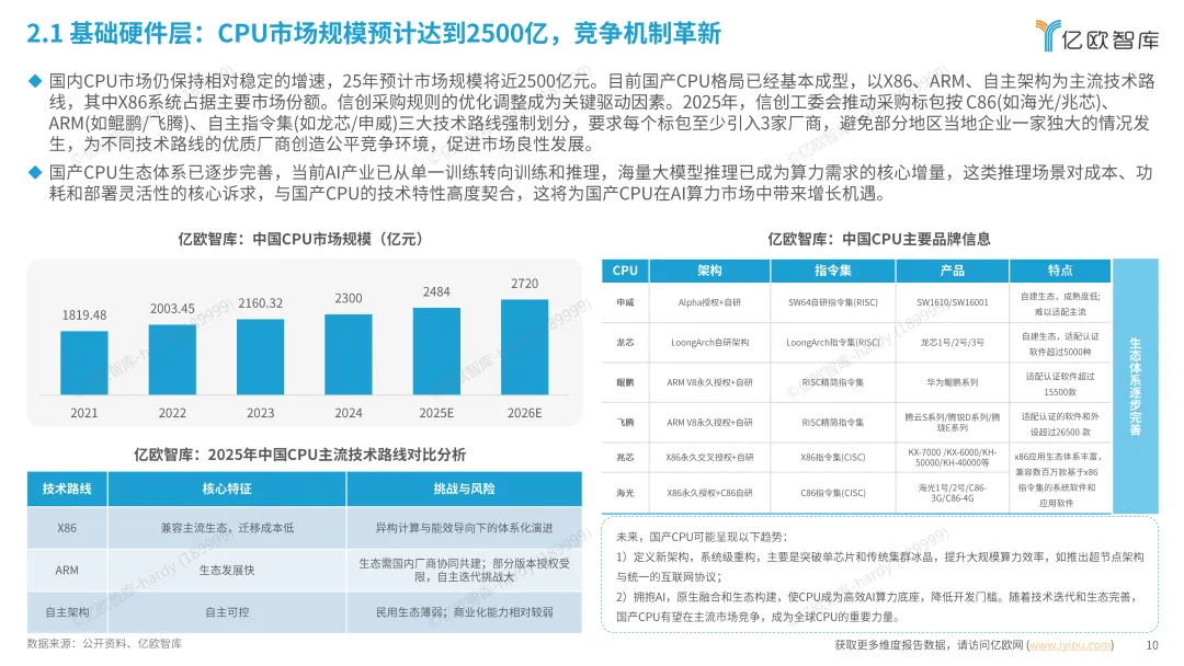 CPU 市场规模 2025 年预计近 2500 亿元,形成 X86、ARM、自主架构三大技术路线,采购规则优化保障公平竞争。智能算力基础设施快速发展,加速计算服务器支撑 AI 原生应用适配,2024-2028 年智能算力规模 CAGR 达 39%。