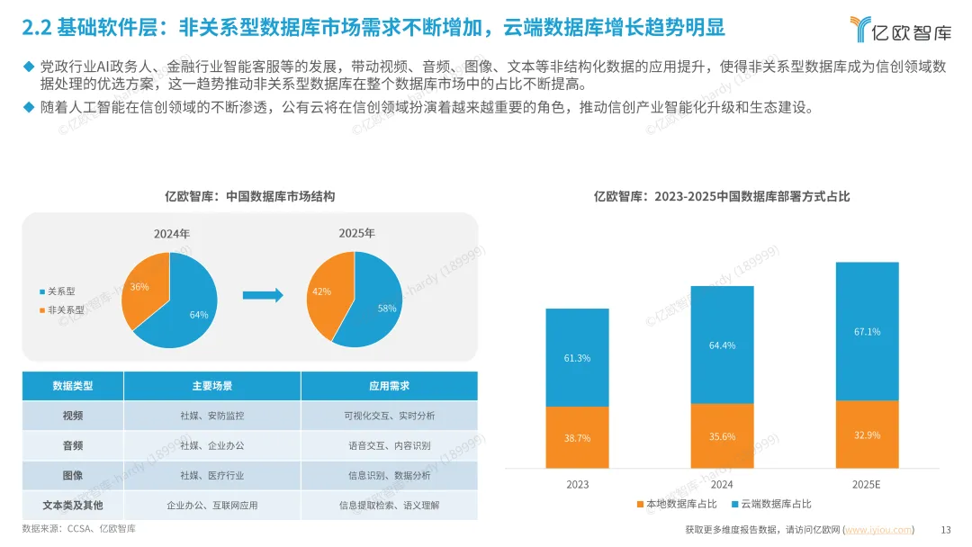 国产数据库需求扩大,党政行业替换率达 85%,金融、通信从非核心系统向核心系统过渡。非关系型数据库与云端数据库成为增长热点,信创云与 AI、大数据融合,向场景化、智能化、价值化演进,覆盖政务、金融、医疗、教育等领域。