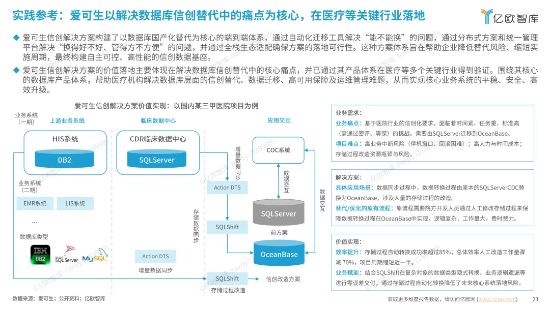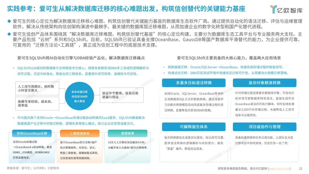 兆芯掌握自主通用处理器核心技术,PC 终端产品占信创市场 40%~50% 份额,KH-50000 服务器处理器推动核心应用转型。海光信息 C86 技术体系兼容 X86 生态,产品覆盖政务、金融等关键行业,支持业务 0 痛感迁移。思腾合力构建国产化 AI 算力底座,四层解决方案架构实现 “需求 - 方案 - 价值” 闭环。爱可生 SQLShift 工具解决数据库迁移痛点,在医疗行业落地成效显著,迁移效率提升 70%。
