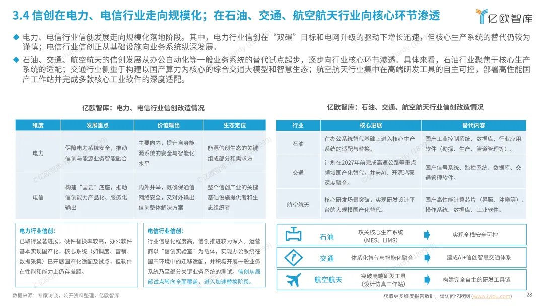 金融信创进入规模化落地阶段,从银行业向券商、保险渗透,2025 年底前央企及国企办公 OA 系统将 100% 国产化。电力、电信行业走向规模化推广,电力聚焦智能电网数字化,电信构建 “国云” 底座。石油、交通、航空航天向核心业务环节渗透,医疗、教育虽渗透率不足 10%,但试点增多,进入关键启动期。