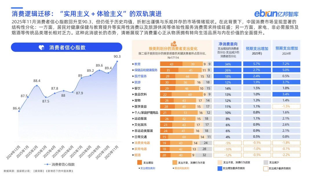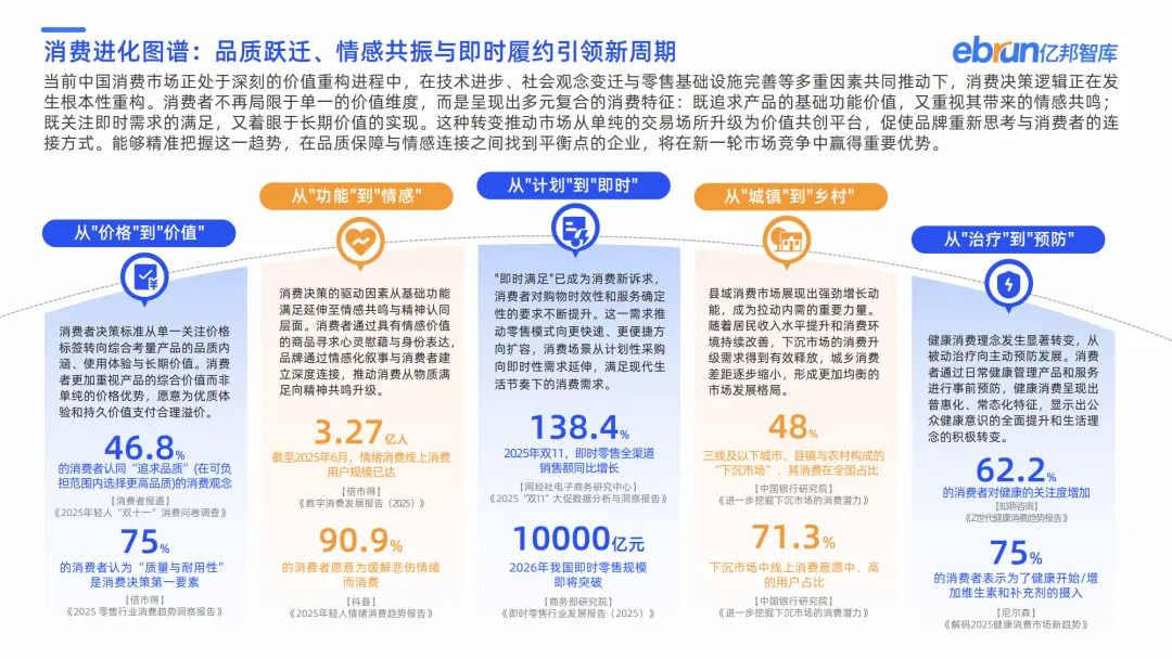 2025 年中国消费市场迈入存量精耕与结构变革新阶段,社会消费品零售总额突破 50 万亿元,线上渠道从爆发式扩张转向成熟整合,网络购物渗透率接近九成,增长动力聚焦存量价值深耕。消费逻辑呈现 “实用主义 + 体验主义” 双轨演进,健康保健、教育提升等实用消费与旅游休闲等体验消费需求旺盛,推动市场从物质消费向品质与价值消费升级。